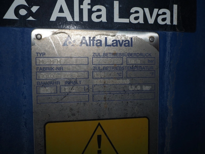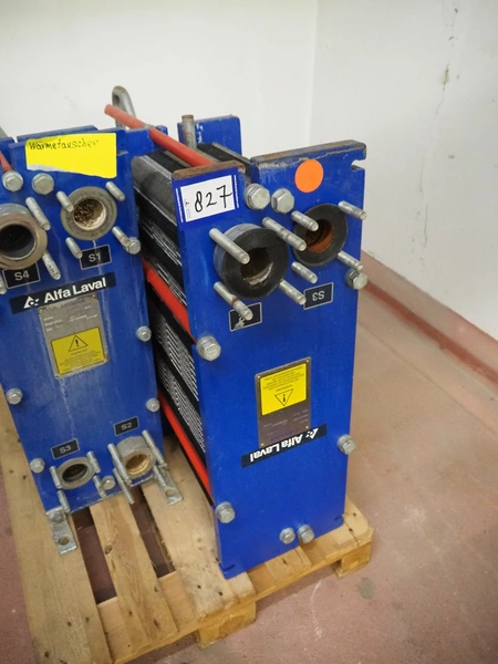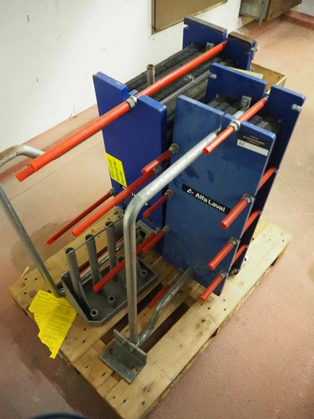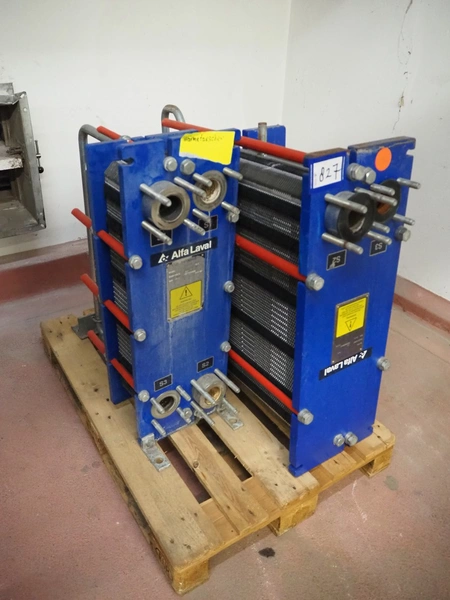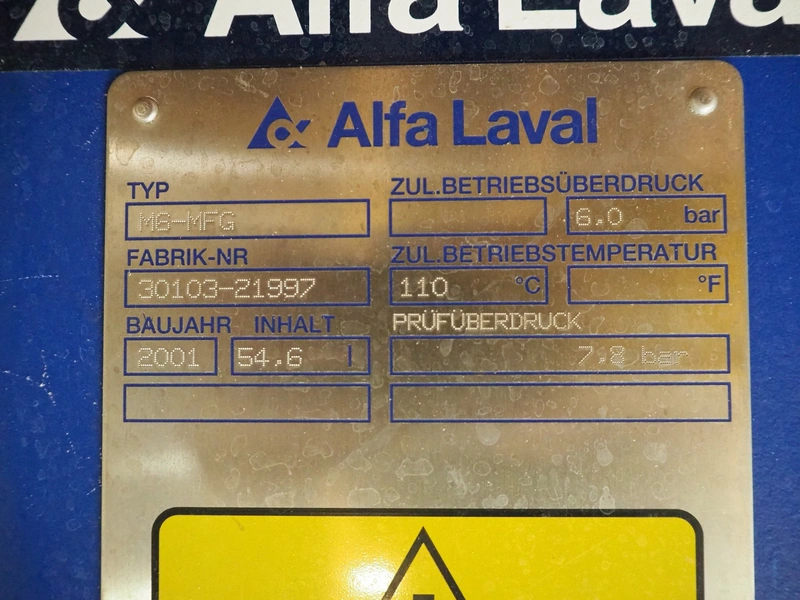 2 Alfa Laval heat exchangers, type: MG-MFM and MG-MFG, fabrication number: 30103-30536 and 30103-21997, year of construction: 2001, volume: 15.6 and 54.6 liter, maximum temperature: 110°C, dimensions: 1100 mm x 350 mm x 900 mm and 700 mm x 330 mm x 900 mm.
