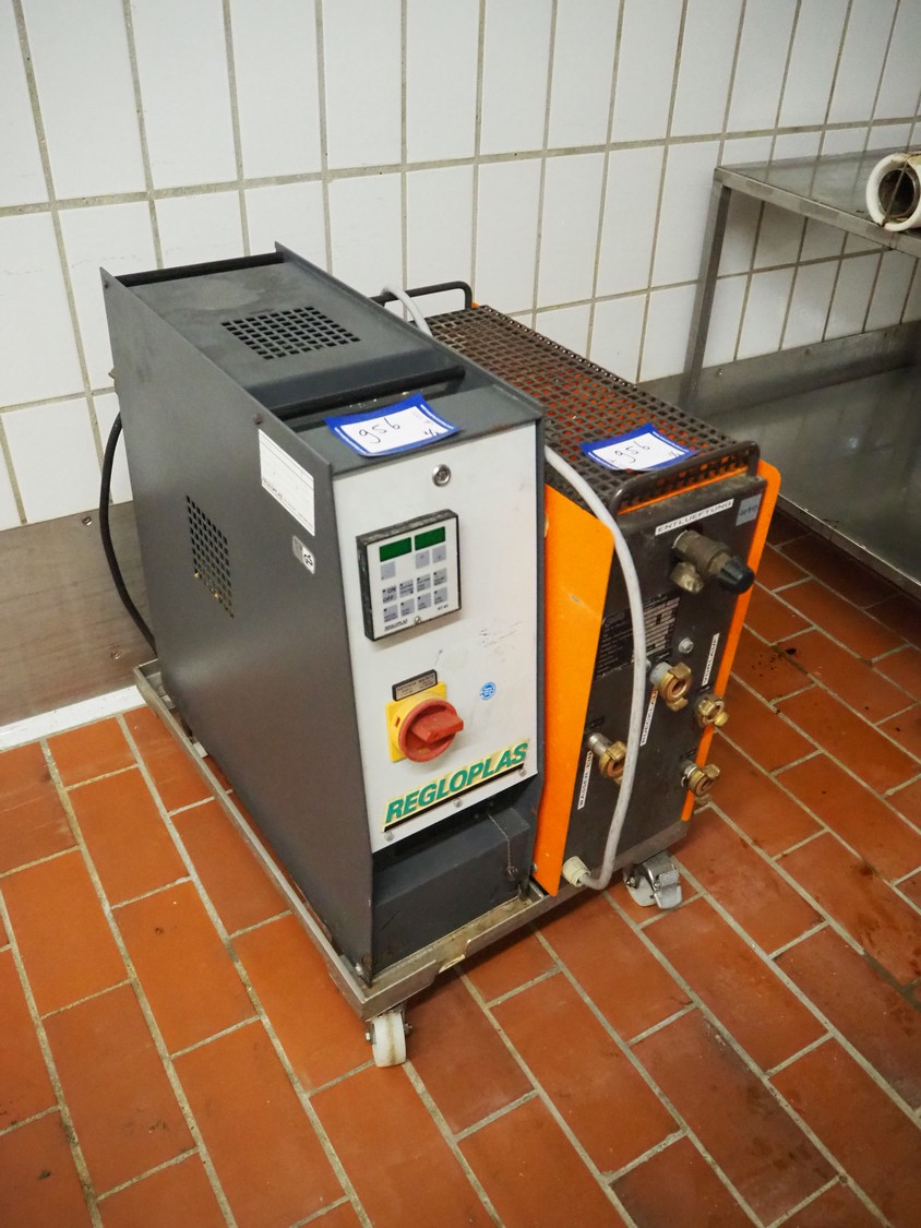 GWK temperature control unit and Regoplas temperature control unit, type: 150 KL / 7 / TB21 / 1K / RT40, 380 V, 1 Ph, 50 Hz, 12.2 A, 7.6 kW, volume: 9.6 dm³, maximum: 90˚C, type: TW 33, serial number: 11 2219 00, year of construction: 1987, 380 / 220 V, 50 Hz, 14.6 A, heating capacity: 3 kW, dimensions: 230 mm x 620 mm x 600 mm and dimensions: 230 mm x 750 mm x 750 mm.
