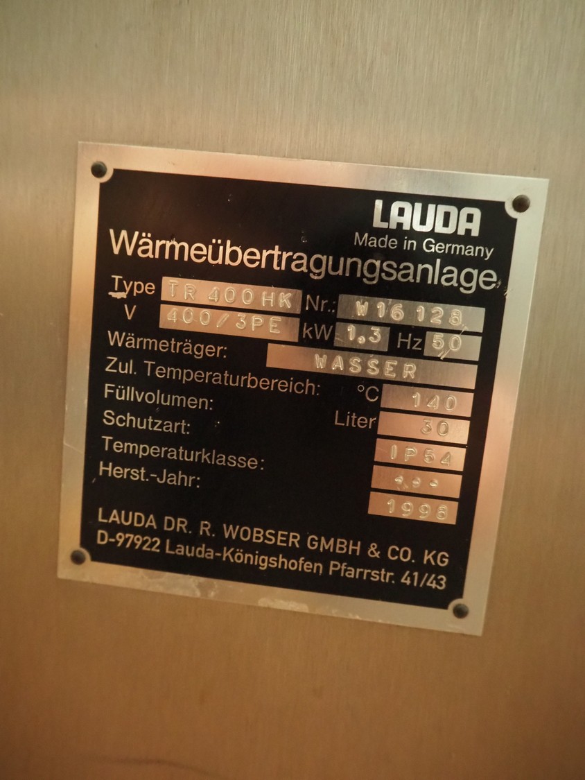 Lauda secondary circuit system, type: TR400HK, fabrication number: W16 128, total dimensions: 770 mm x 1000 mm x 1380 mm.