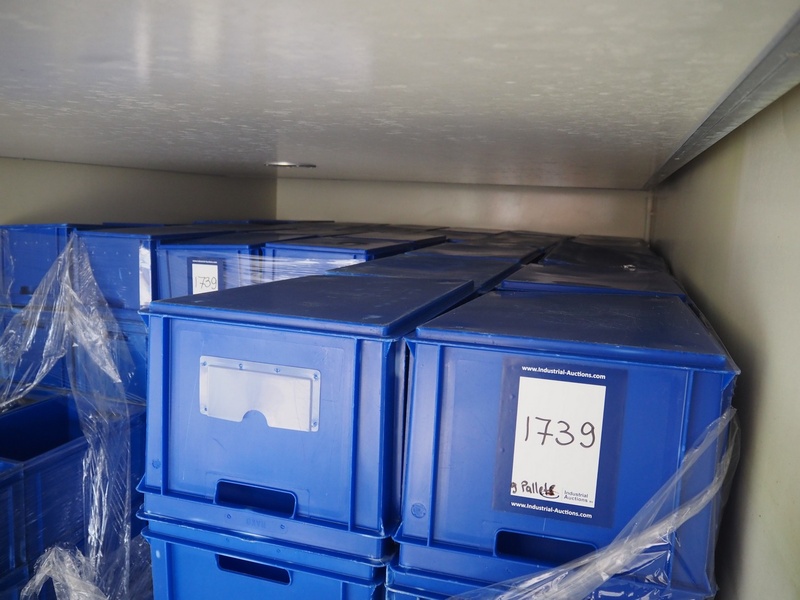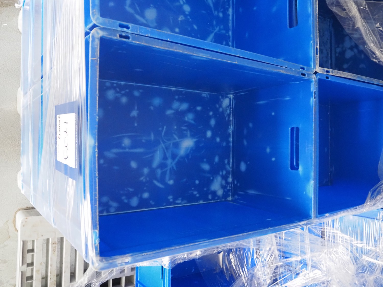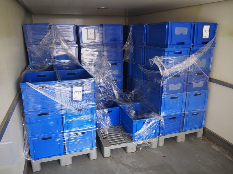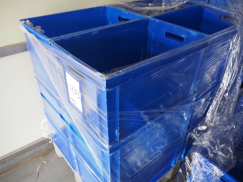 9 pallets with approximately 184 plastic crates, each crate dimensions: 600 mm x 400 mm x 300 mm.