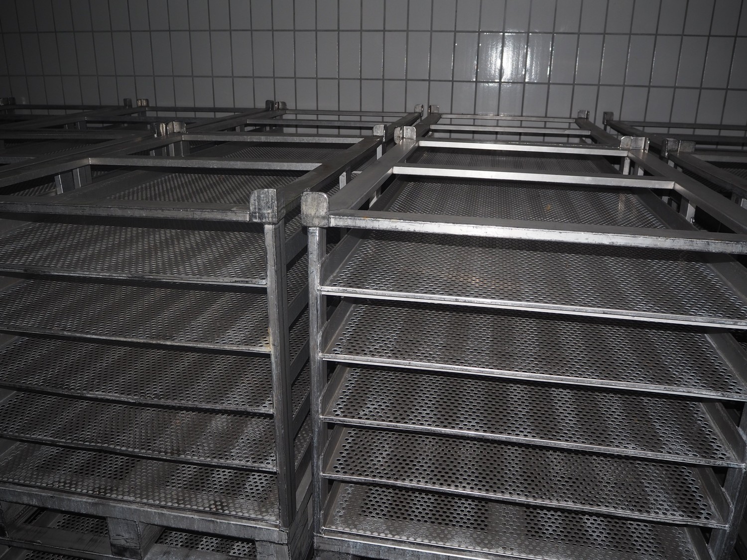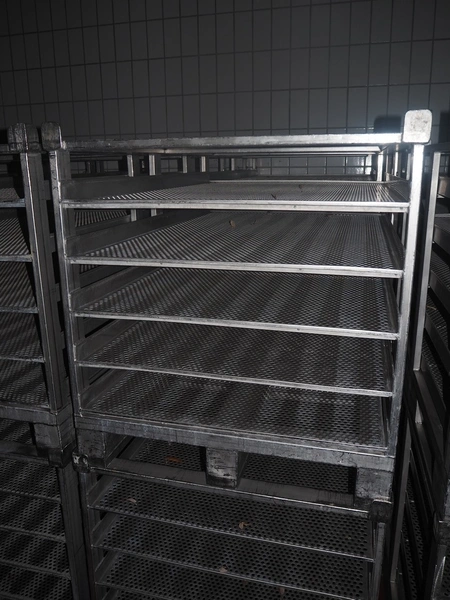 8 s/s cooking racks, 5 floors each, dimensions each floor: 1200 mm x 750 mm, total dimensions: (8x) 1200 mm x 800 mm x 870 mm.