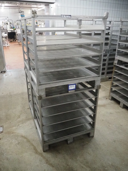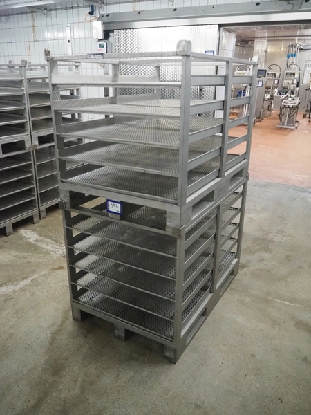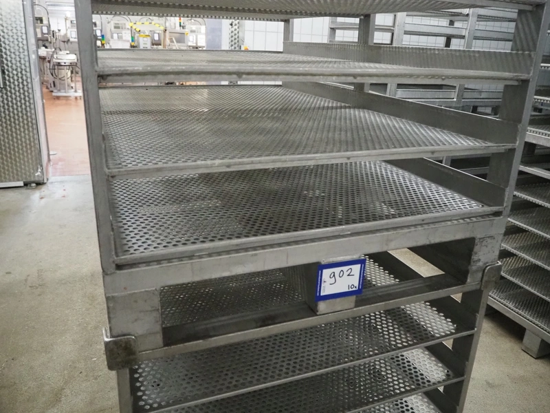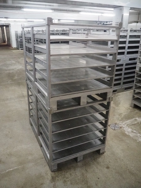 10 s/s cooking racks, 5 floors each, dimensions each floor: 1200 mm x 750 mm, total dimensions: (10x) 1200 mm x 800 mm x 870 mm.