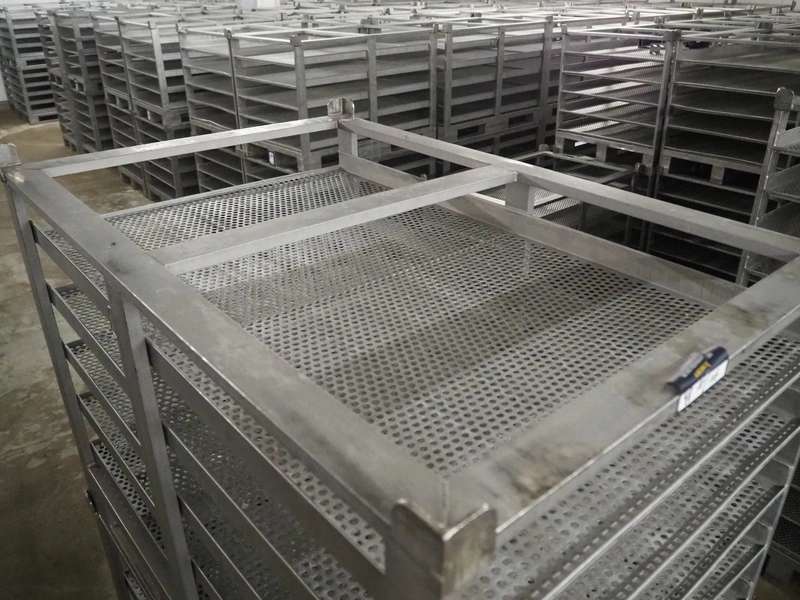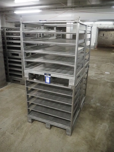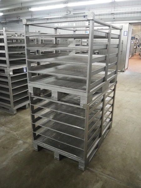 19 s/s cooking racks, 5 floors each, dimensions each floor: 1200 mm x 750 mm, total dimensions: (19x) 1200 mm x 800 mm x 870 mm.