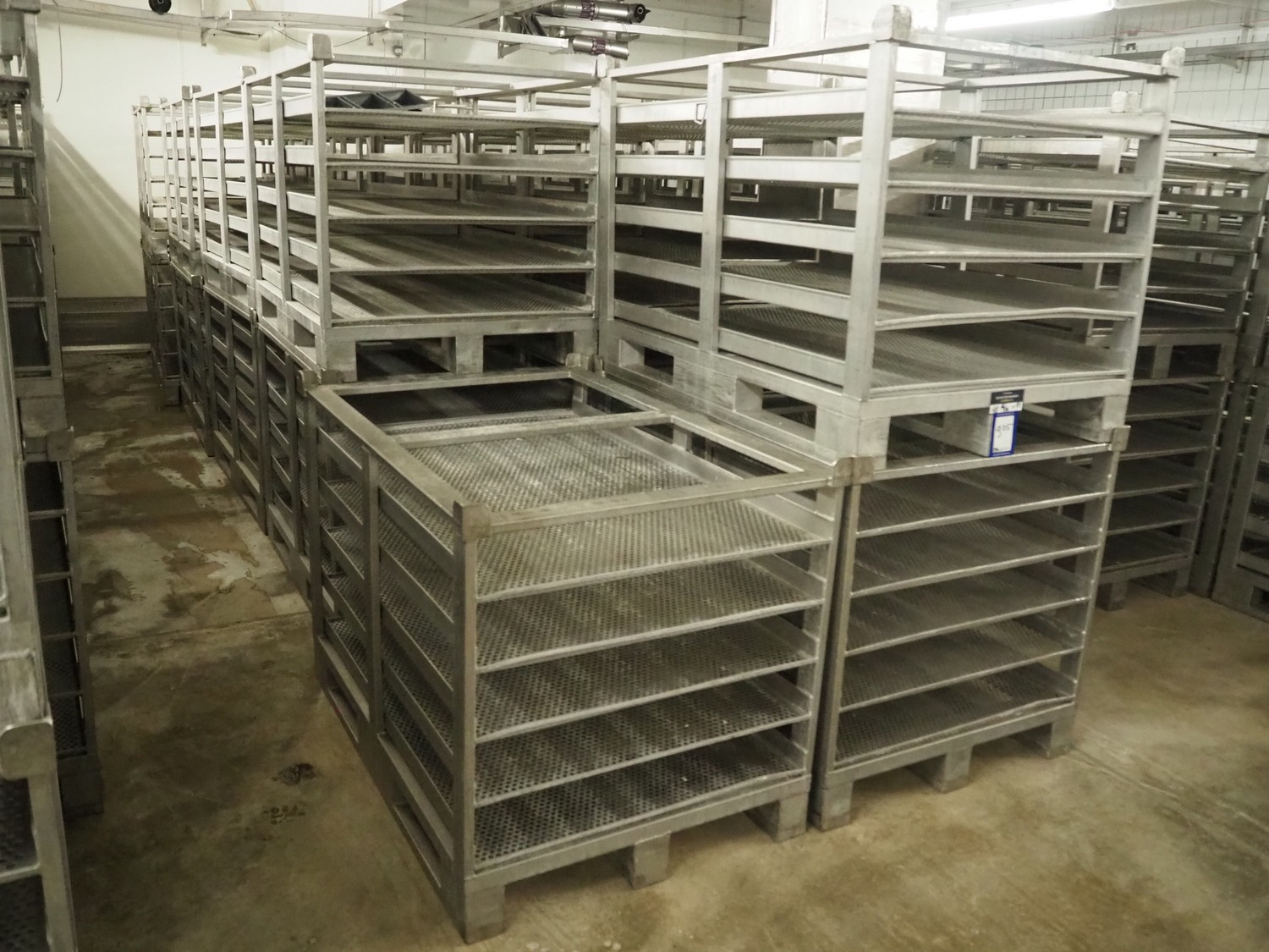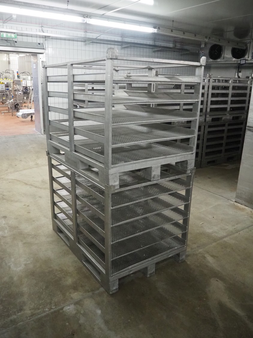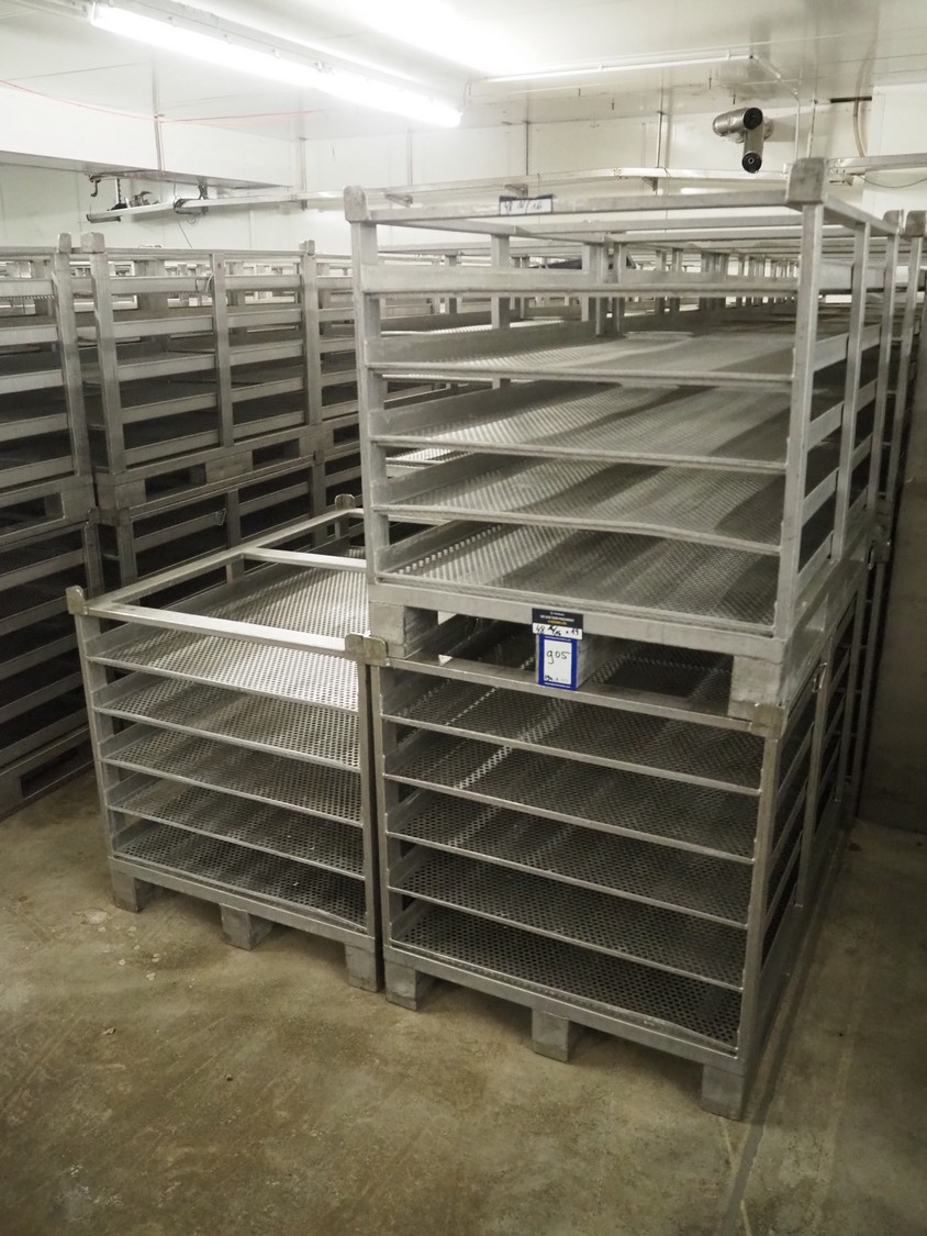 19 s/s cooking racks, 5 floors each, dimensions each floor: 1200 mm x 750 mm, total dimensions: (19x) 1200 mm x 800 mm x 870 mm.