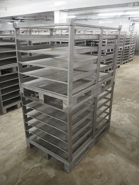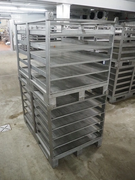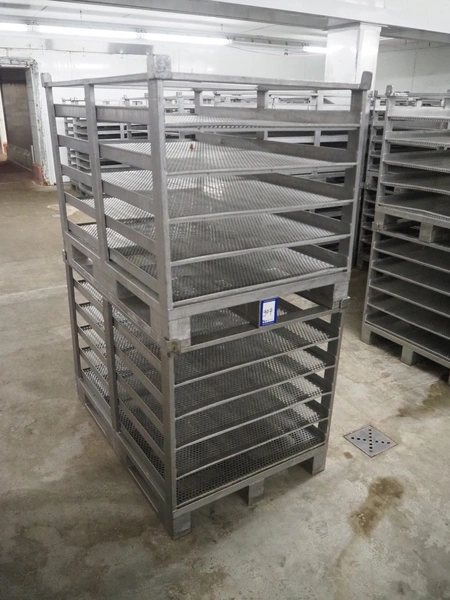 24 s/s cooking racks, 5 floors each, dimensions each floor: 1200 mm x 750 mm, total dimensions: (24x) 1200 mm x 800 mm x 870 mm.