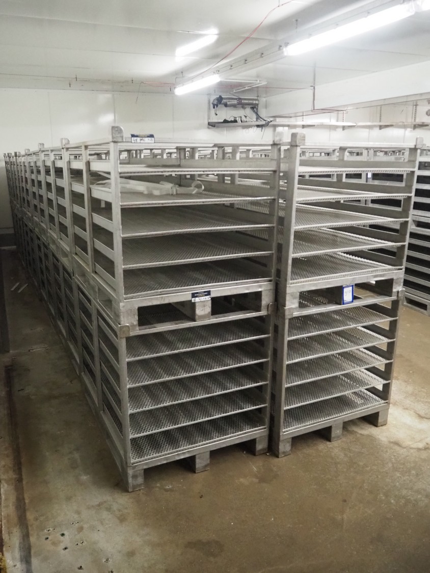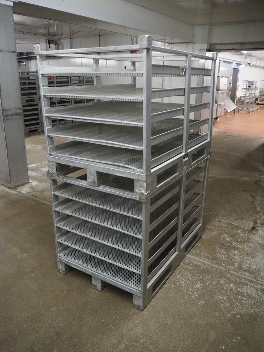 24 s/s cooking racks, 5 floors each, dimensions each floor: 1200 mm x 750 mm, total dimensions: (24x) 1200 mm x 800 mm x 870 mm.