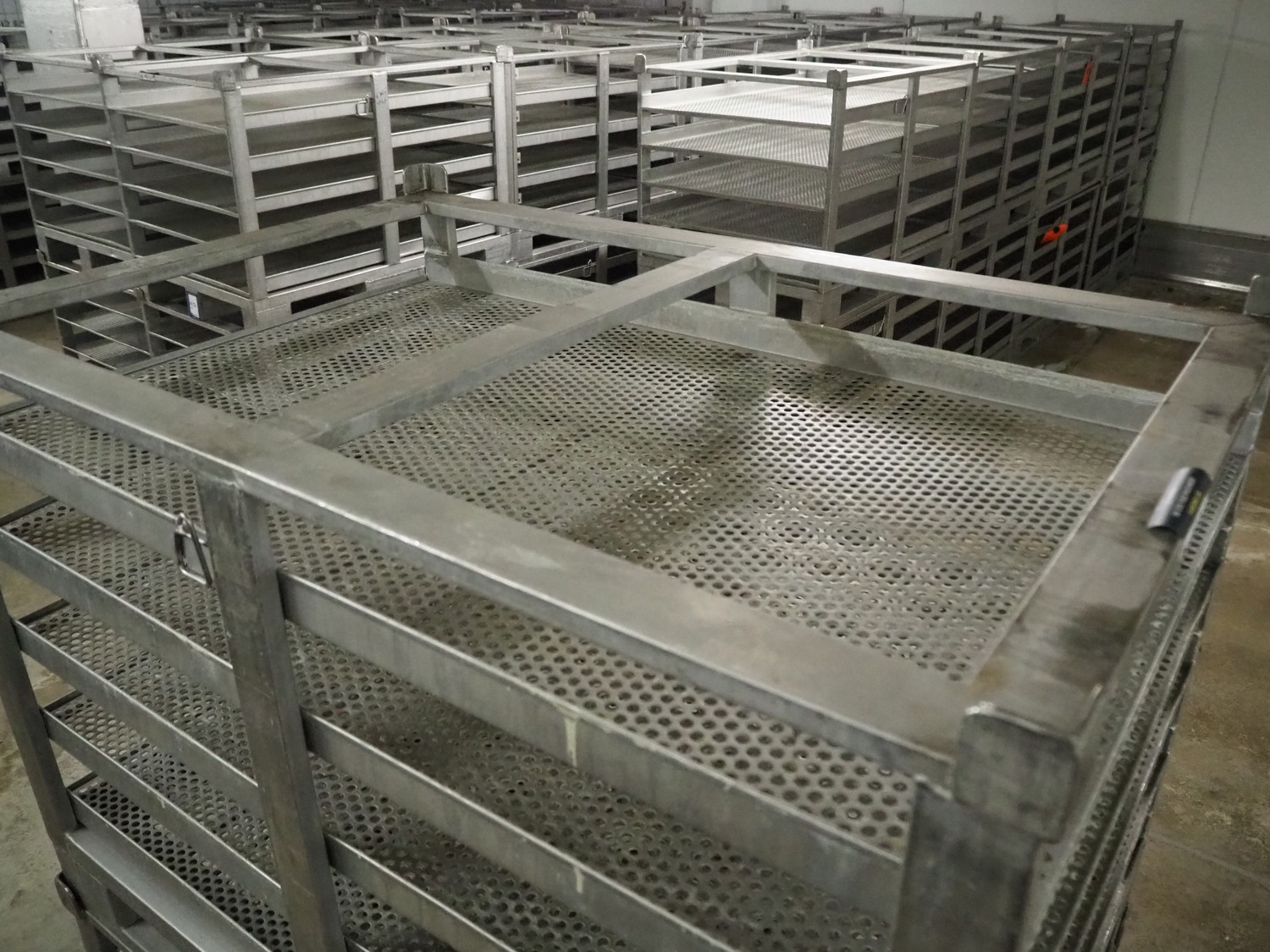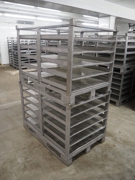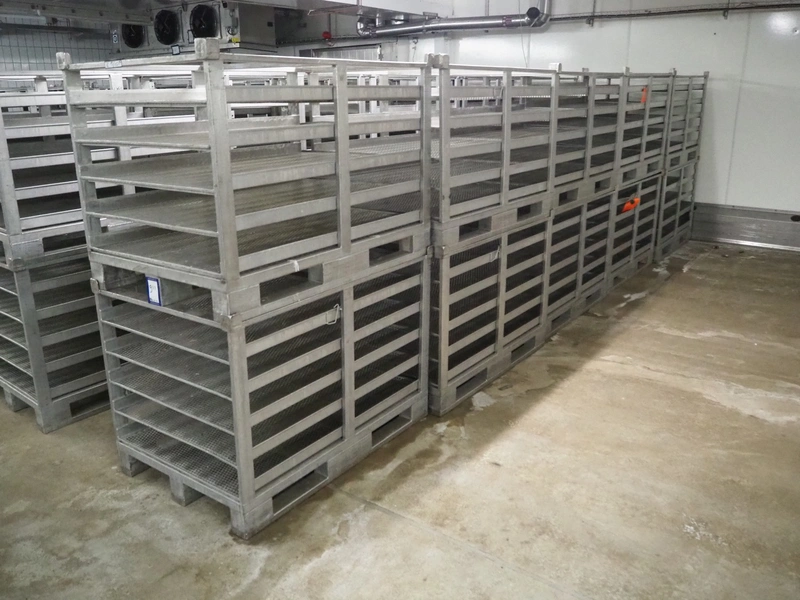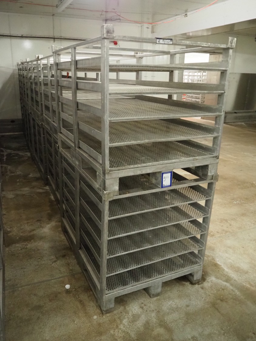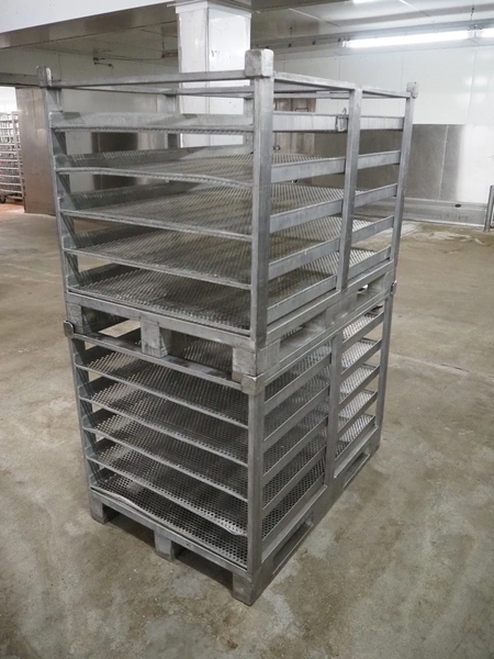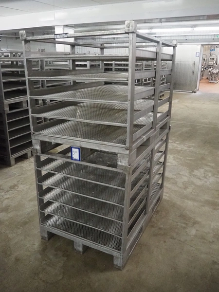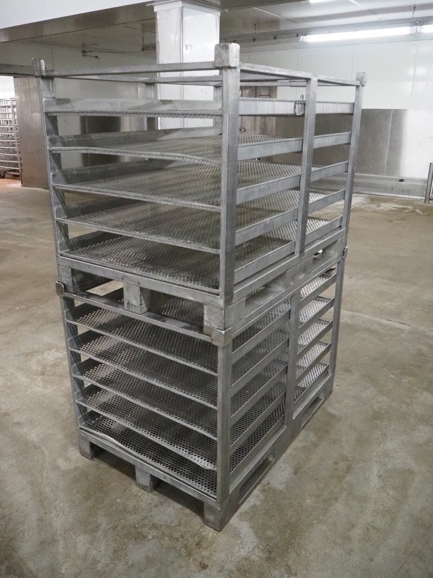 10 s/s cooking racks, 5 floors each, dimensions each floor: 1200 mm x 750 mm, total dimensions: (10x) 1200 mm x 800 mm x 870 mm.