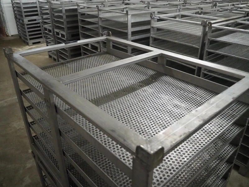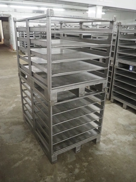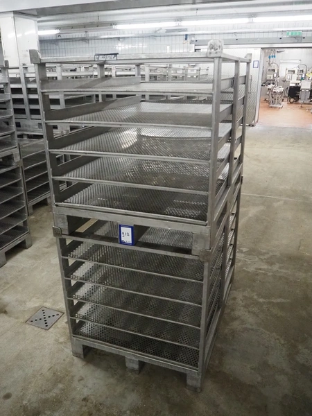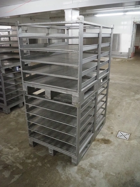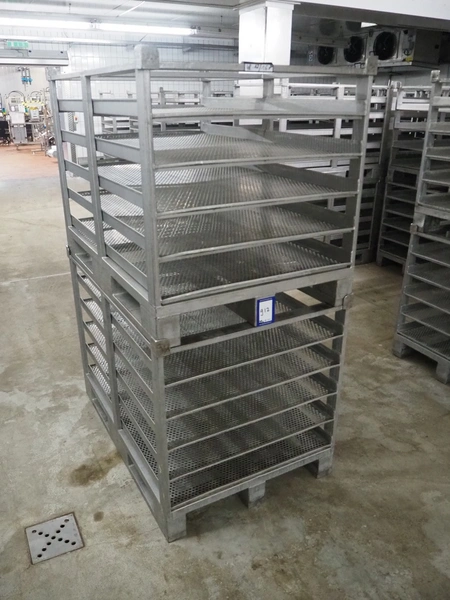 20 s/s cooking racks, 5 floors each, dimensions each floor: 1200 mm x 750 mm, total dimensions: (20x) 1200 mm x 800 mm x 870 mm.