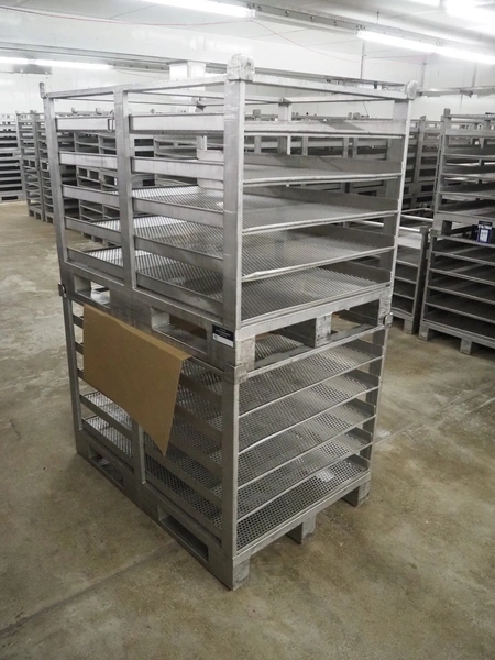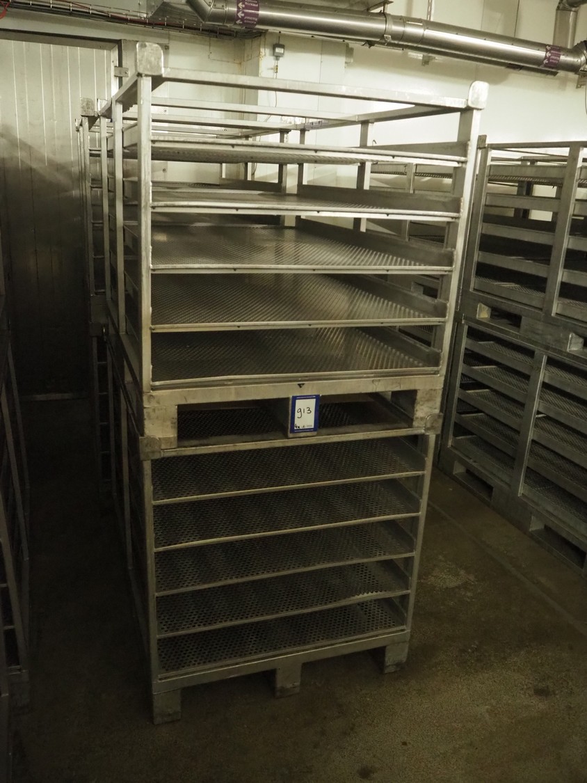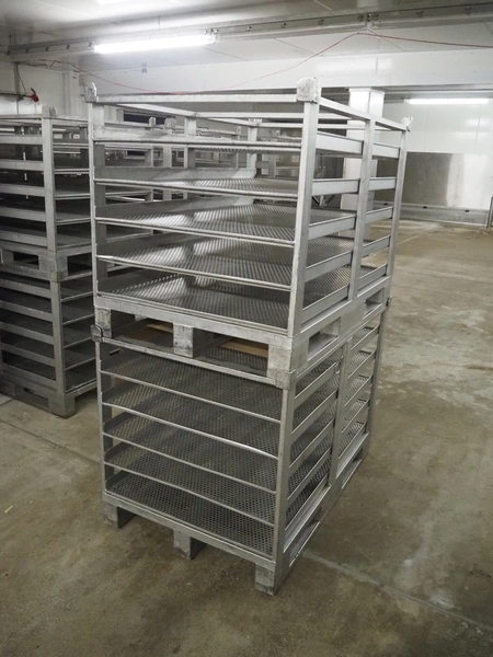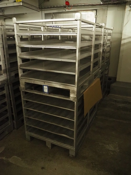 4 s/s cooking racks, 5 floors each, dimensions each floor: 1200 mm x 750 mm, total dimensions: (4x) 1200 mm x 800 mm x 870 mm.