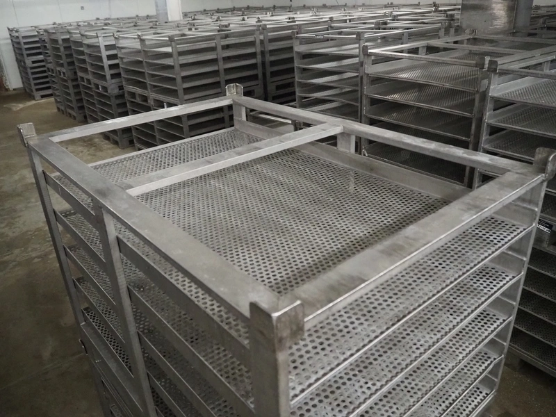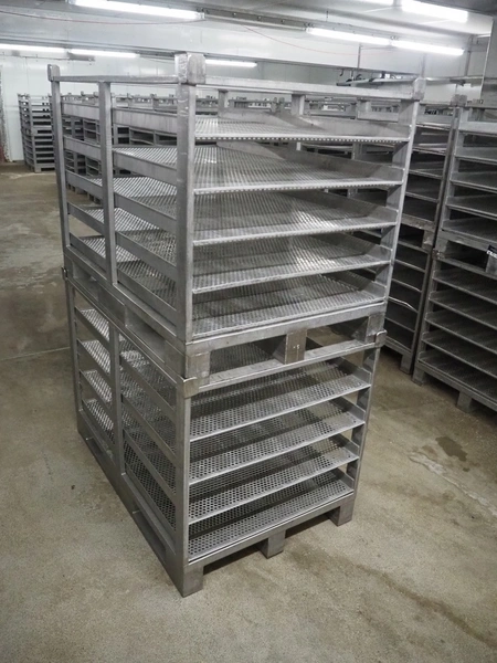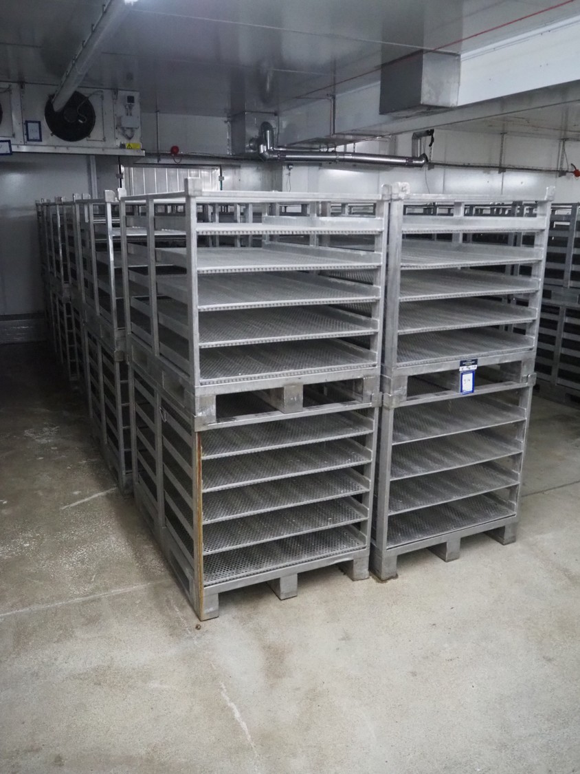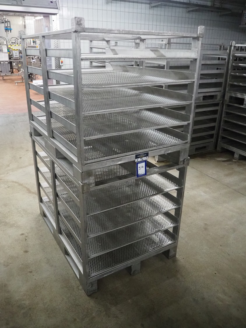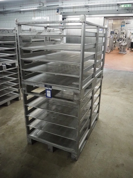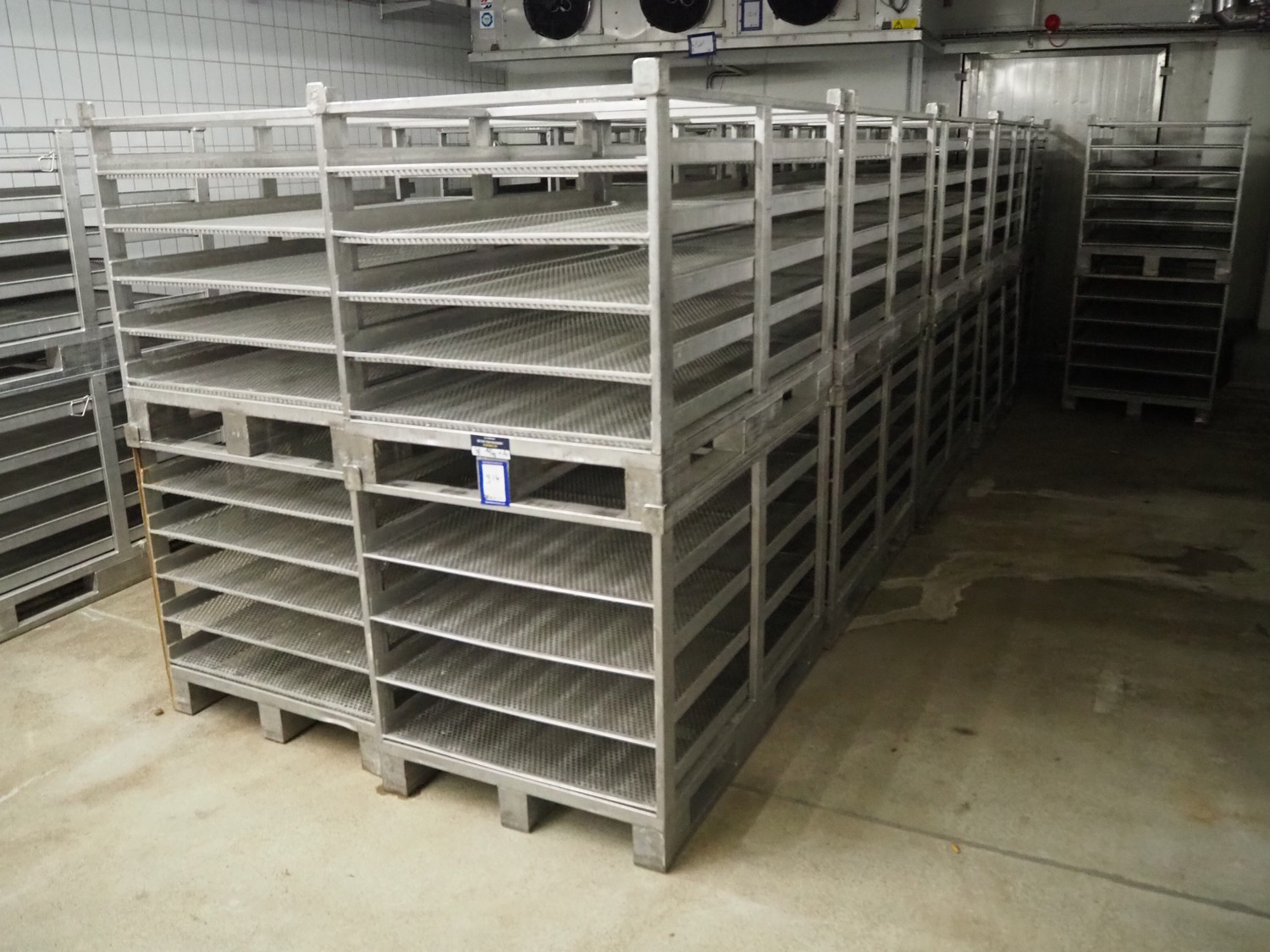 20 s/s cooking racks, 5 floors each, dimensions each floor: 1200 mm x 750 mm, total dimensions: (20x) 1200 mm x 800 mm x 870 mm.
