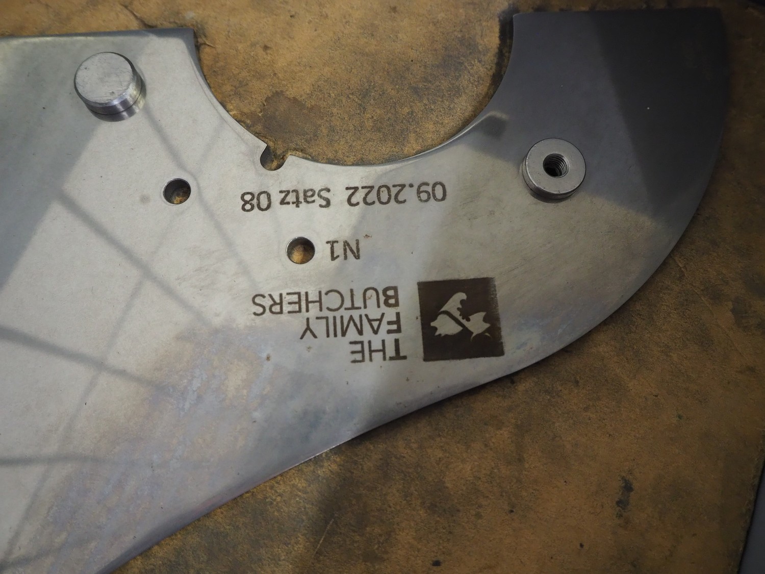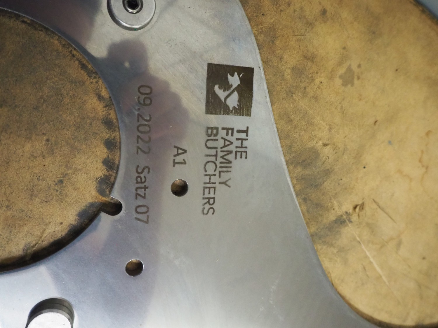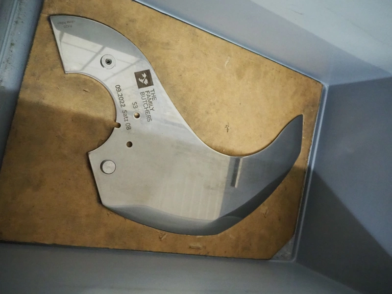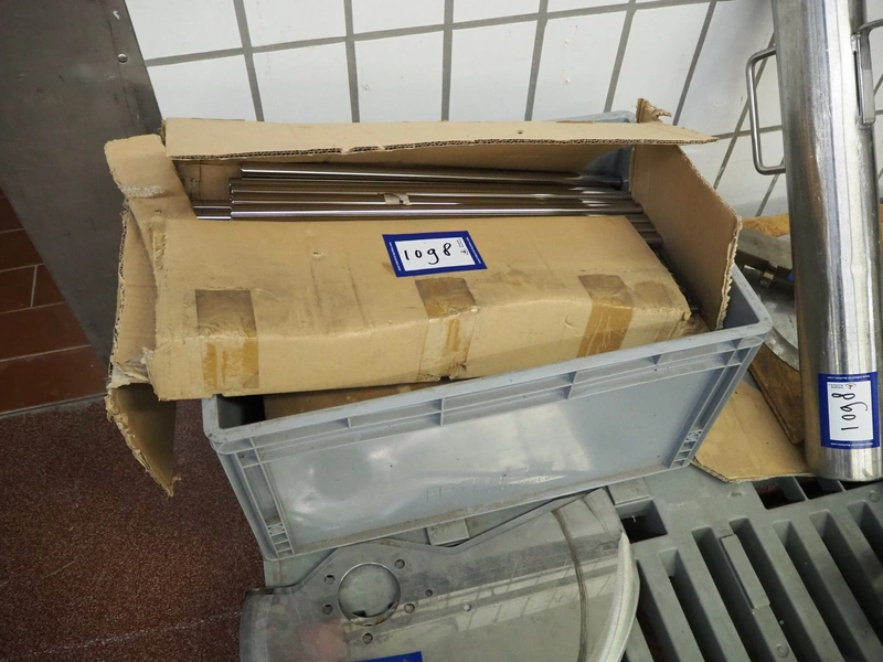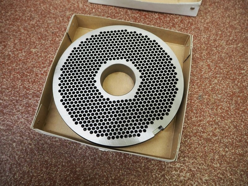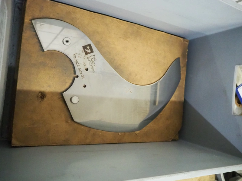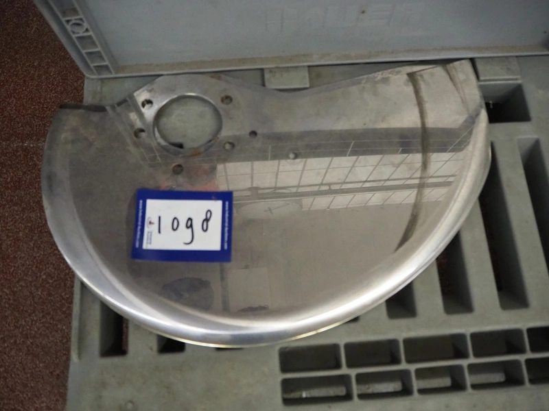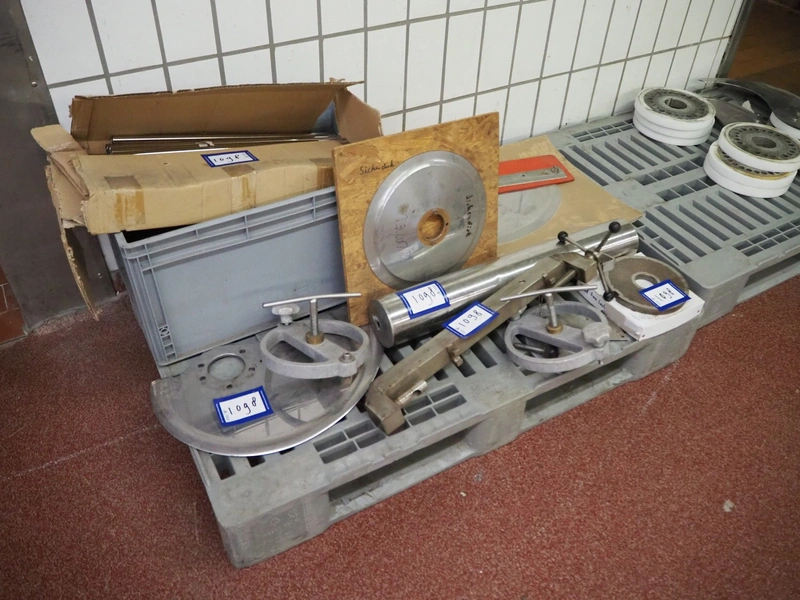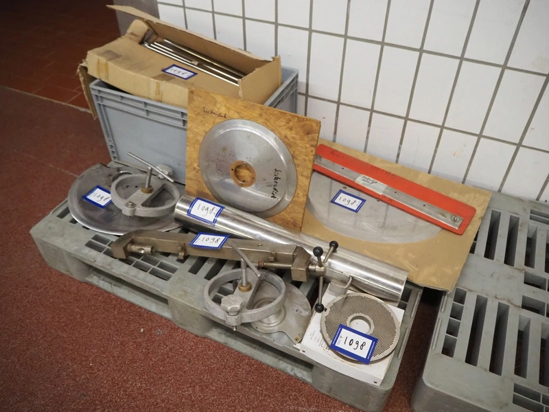 Various machine parts, among others: 3 Lumbeck & Wolter grinder plates, diameter plate: 200 mm, plastic crate with 12 cutter knives, R420, slicer knives, s/s tubes and clamps.