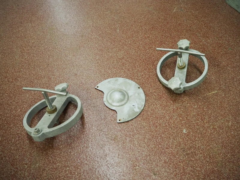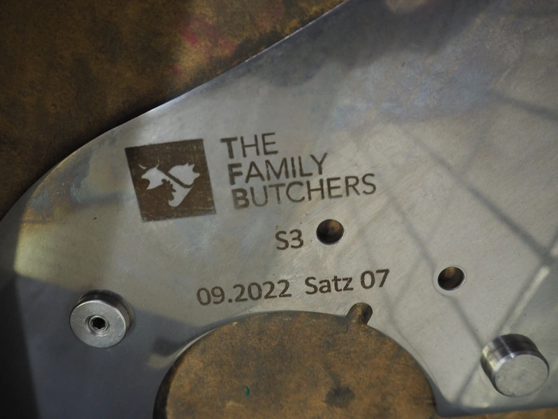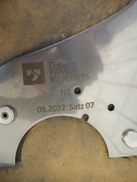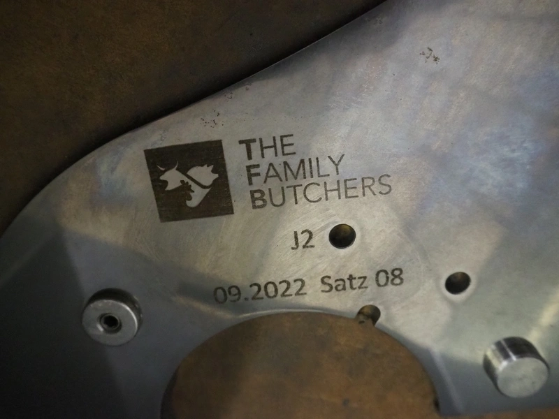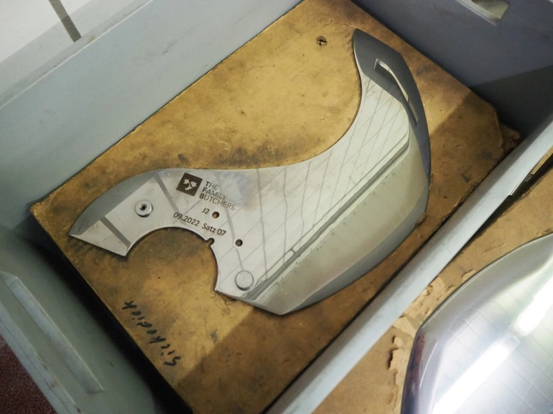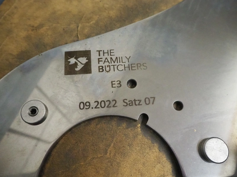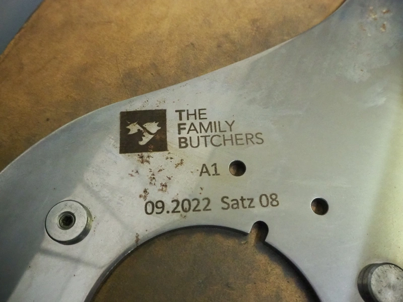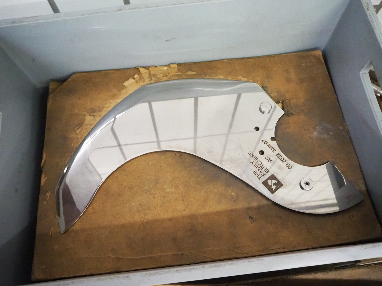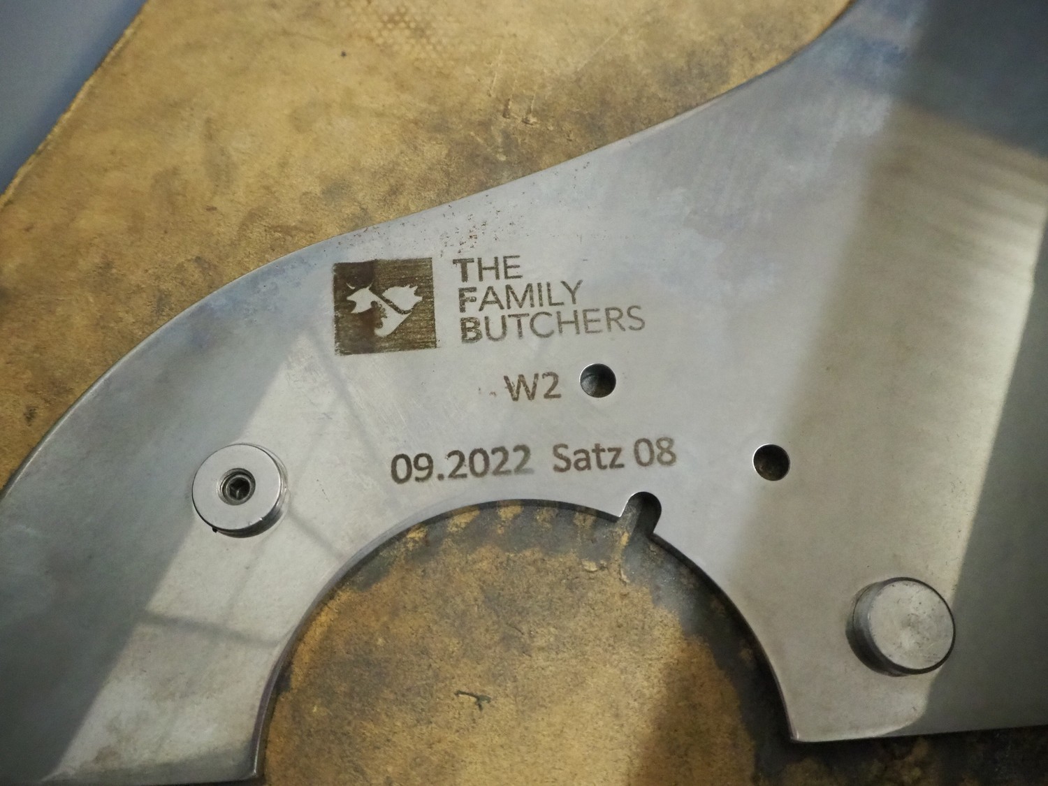 Various machine parts, among others: 3 Lumbeck & Wolter grinder plates, diameter plate: 200 mm, plastic crate with 12 cutter knives, R420, slicer knives, s/s tubes and clamps.