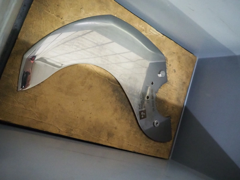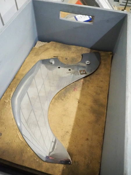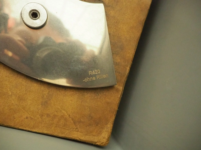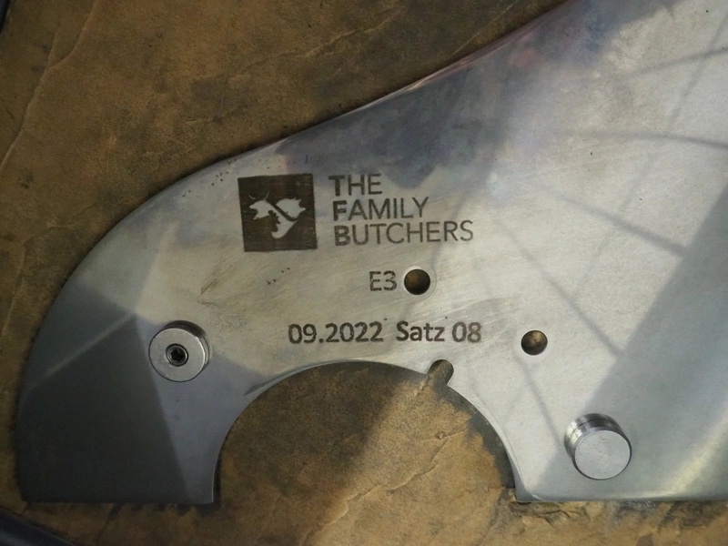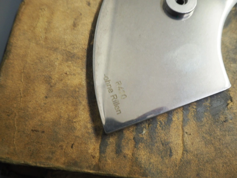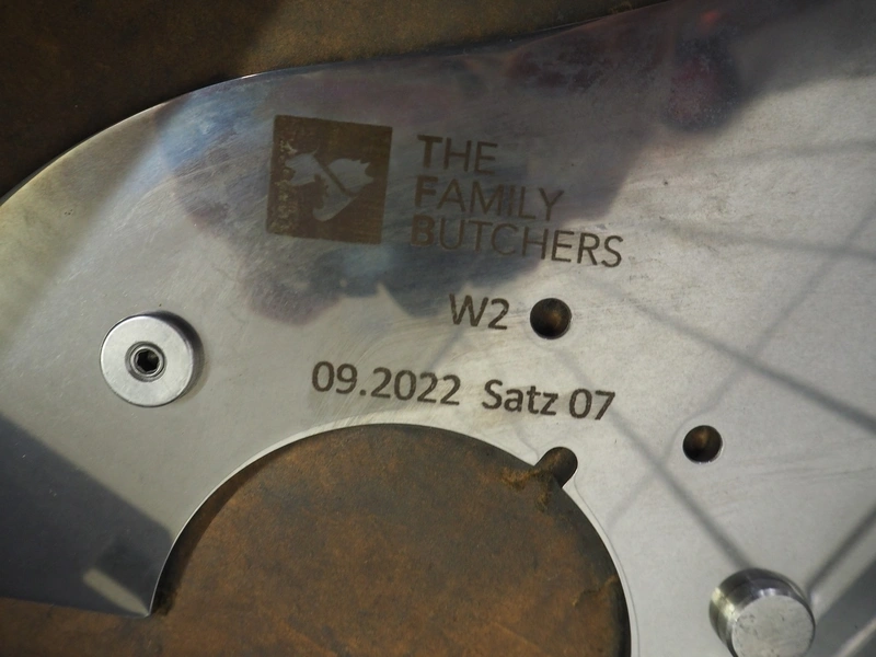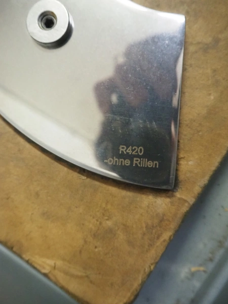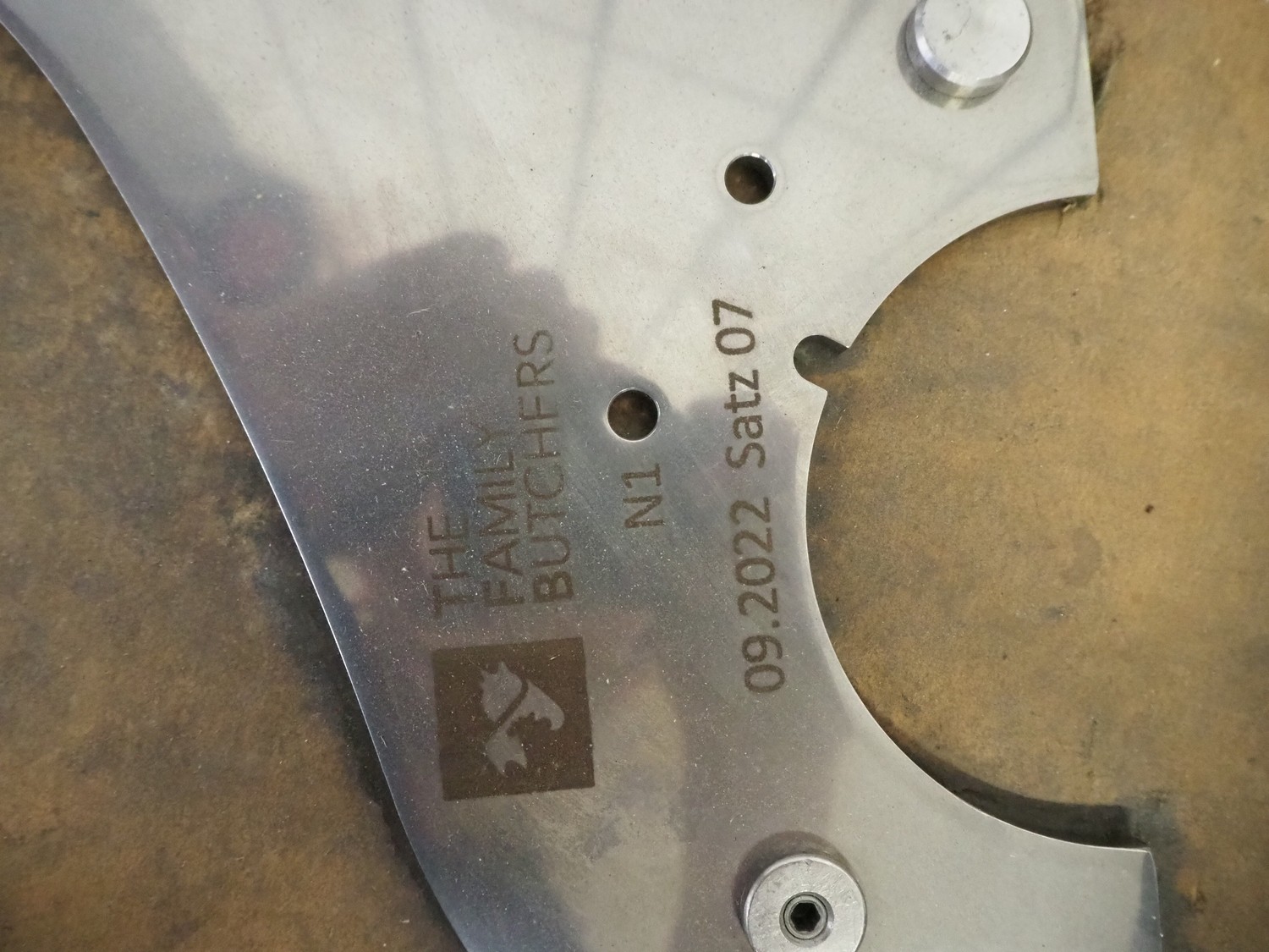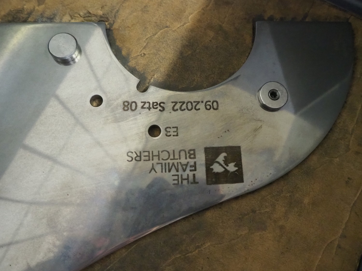 Various machine parts, among others: 3 Lumbeck & Wolter grinder plates, diameter plate: 200 mm, plastic crate with 12 cutter knives, R420, slicer knives, s/s tubes and clamps.