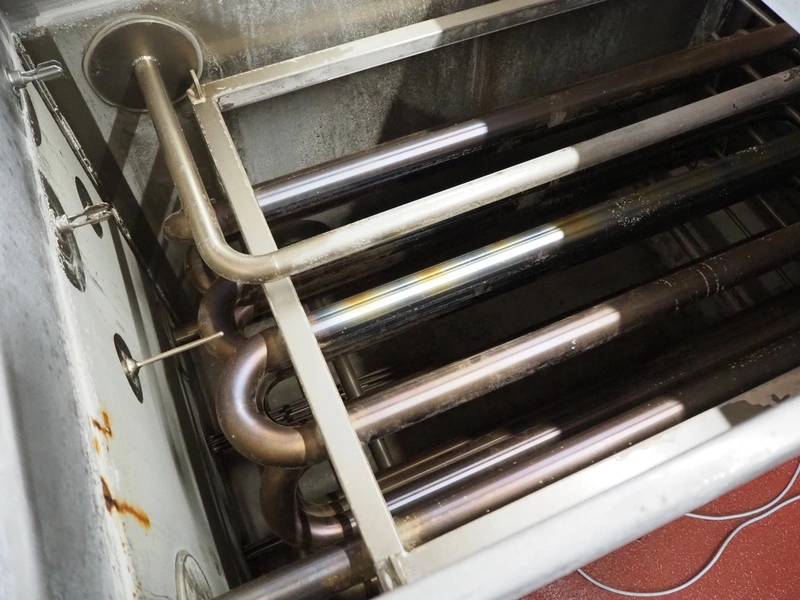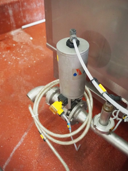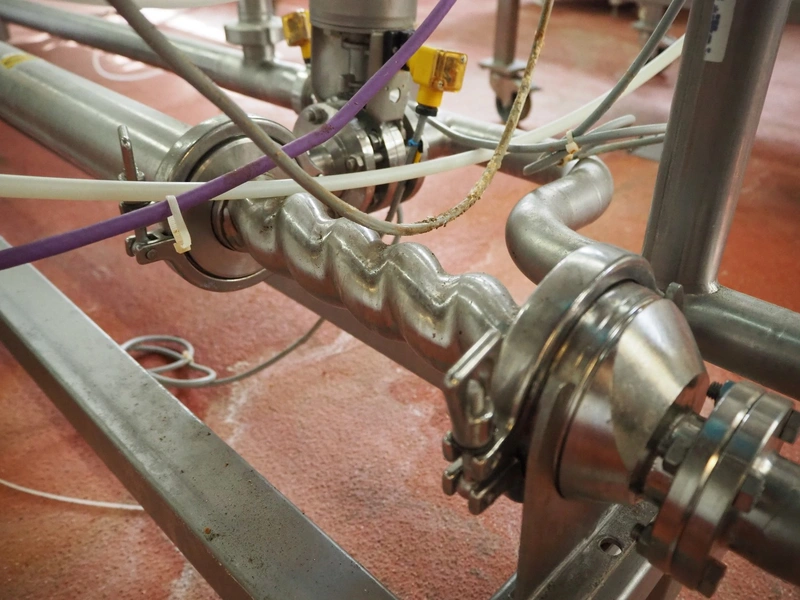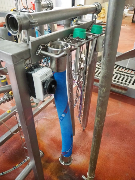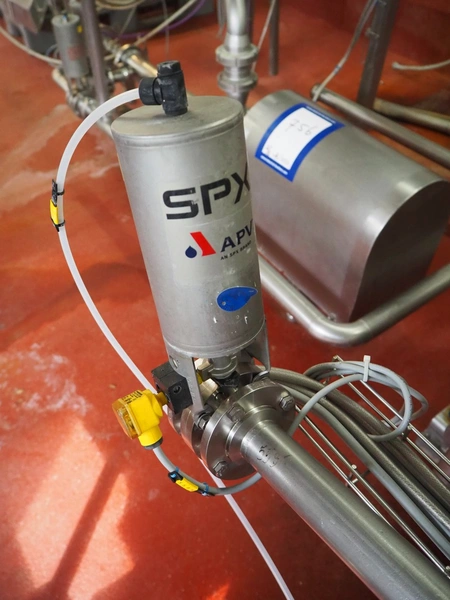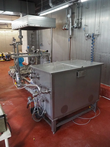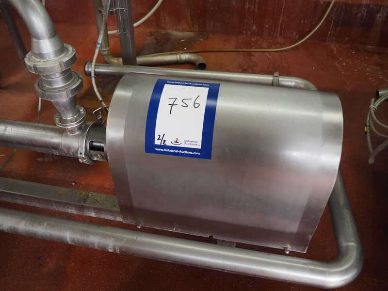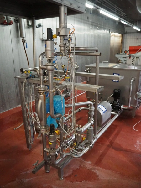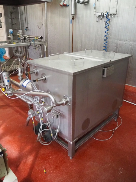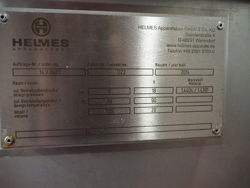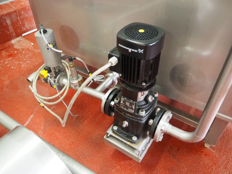 Pump station, consisting of: Helmes Apparatebau GmbH heated tub, vessel number: 1122, year of construction: 2014, design pressure: 0 - 18 bar, design temperature: 90°C, volume: 725 / 20 liter, dimensions tub: 1600 mm x 800 mm x 1200 mm, 2 s/s platform used for IBC tanks, dimensions: (2x) 1400 mm x 1300 mm x 1300 mm, Endress + Hauser flowmeter, s/s progressive cavity pump, dimensions: 2000 mm x 300 mm x 550 mm, Grundfos circulation pump, 8 SPX/APV valves.