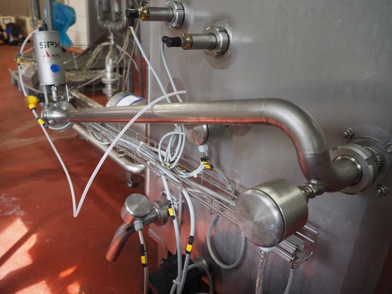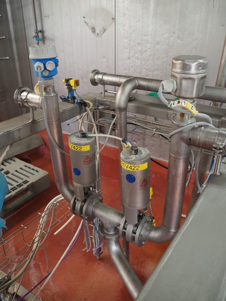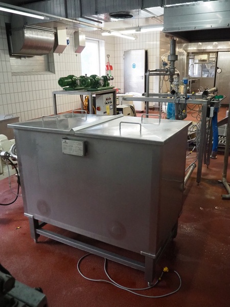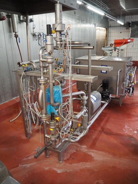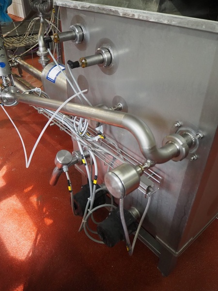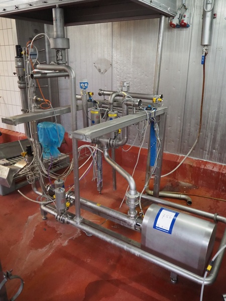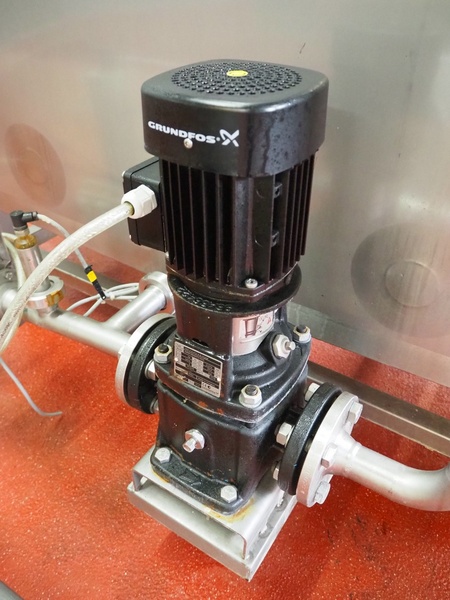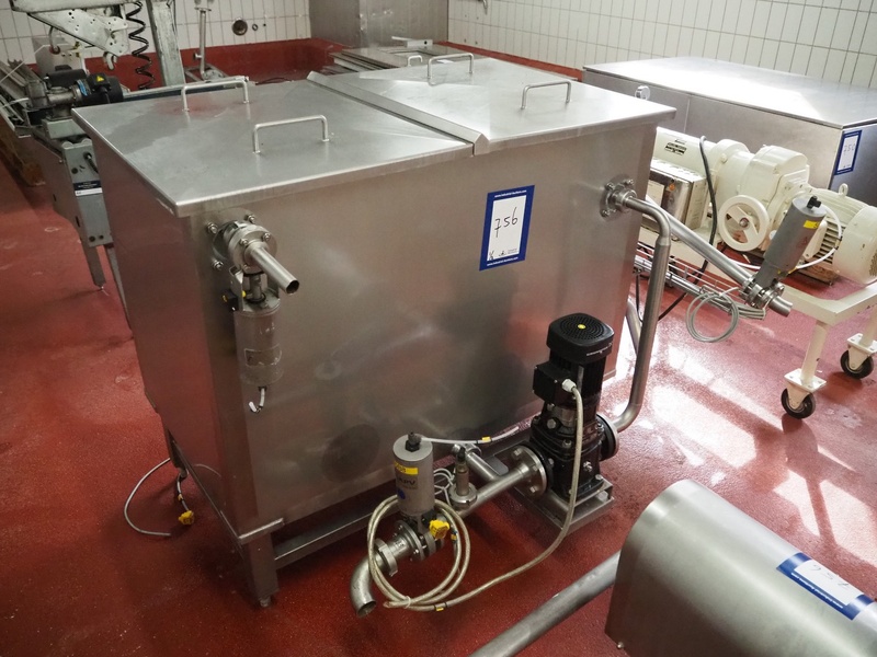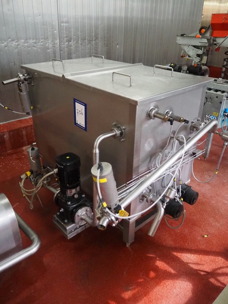 Pump station, consisting of: Helmes Apparatebau GmbH heated tub, vessel number: 1122, year of construction: 2014, design pressure: 0 - 18 bar, design temperature: 90°C, volume: 725 / 20 liter, dimensions tub: 1600 mm x 800 mm x 1200 mm, 2 s/s platform used for IBC tanks, dimensions: (2x) 1400 mm x 1300 mm x 1300 mm, Endress + Hauser flowmeter, s/s progressive cavity pump, dimensions: 2000 mm x 300 mm x 550 mm, Grundfos circulation pump, 8 SPX/APV valves.