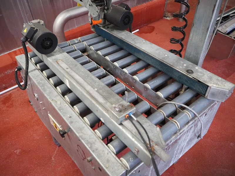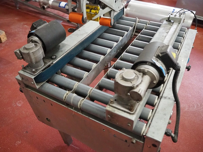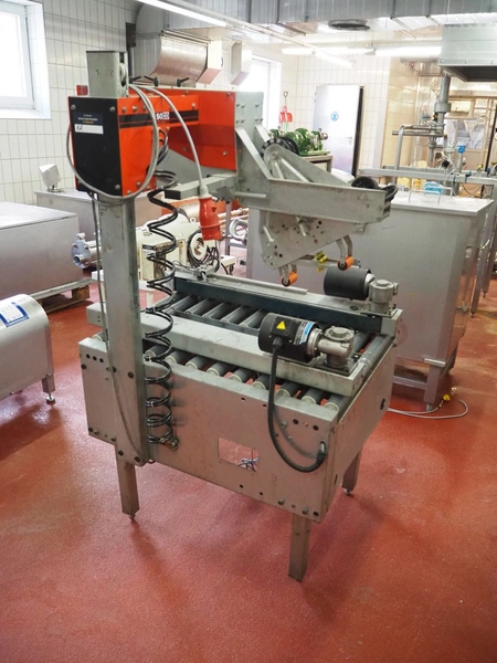 Soco System box closing machine with top taper, model: T-400, number: 304-90, year of construction: 1990, 380 V, 3 Ph, plastic rollers, roller width: 260 mm, total dimensions: 1200 mm x 800 mm x 1700 mm.