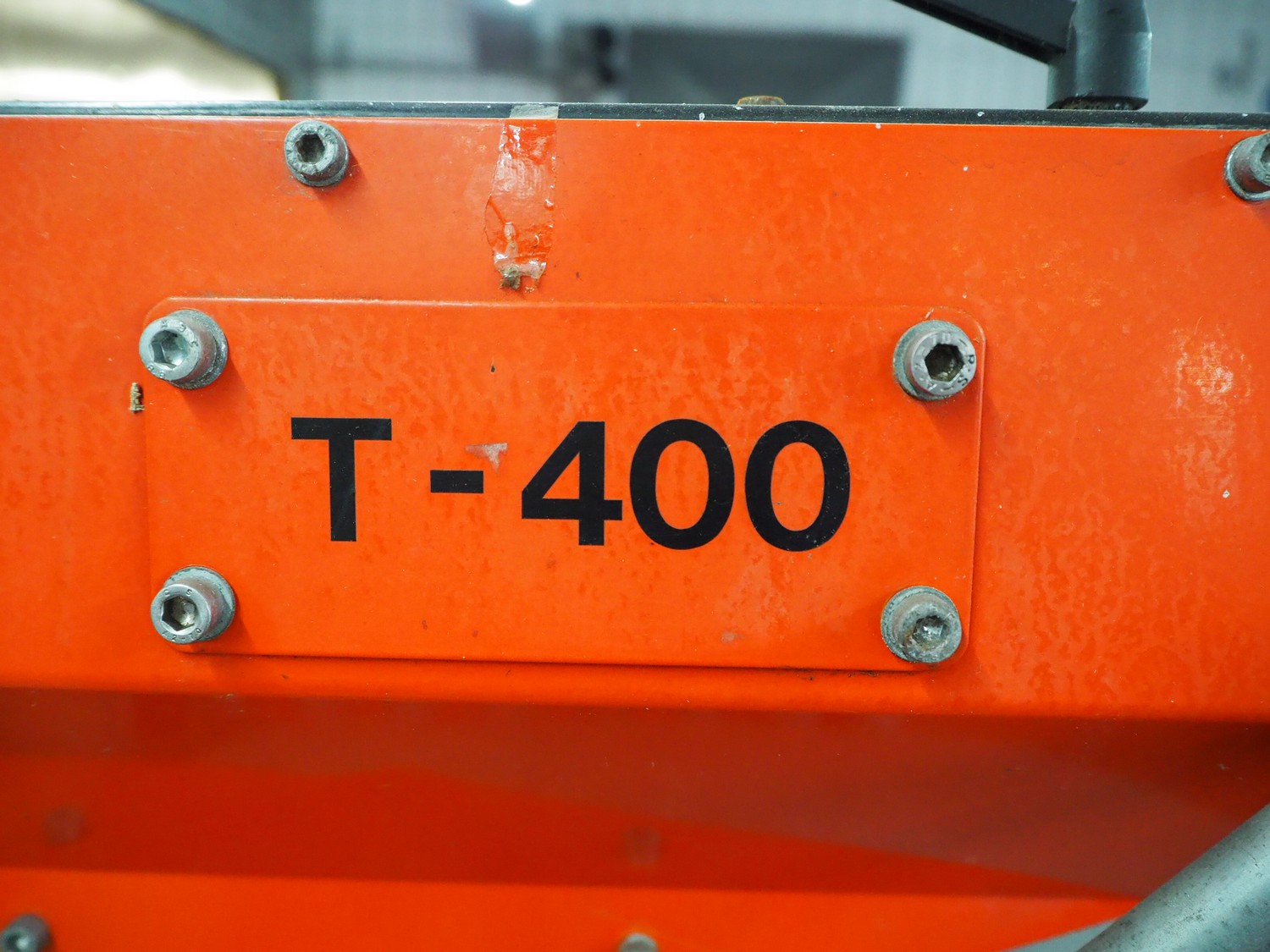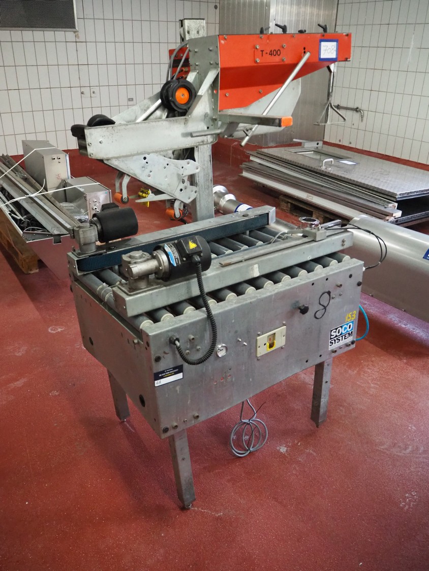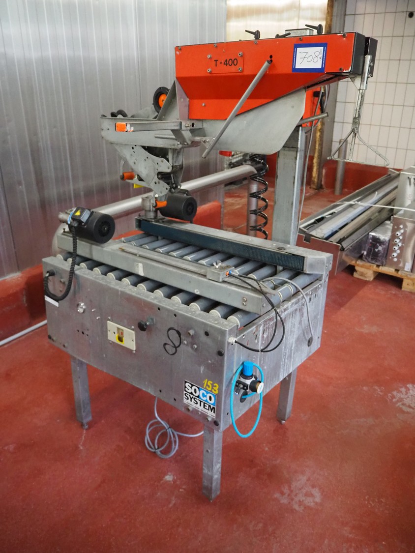 Soco System box closing machine with top taper, model: T-400, number: 304-90, year of construction: 1990, 380 V, 3 Ph, plastic rollers, roller width: 260 mm, total dimensions: 1200 mm x 800 mm x 1700 mm.