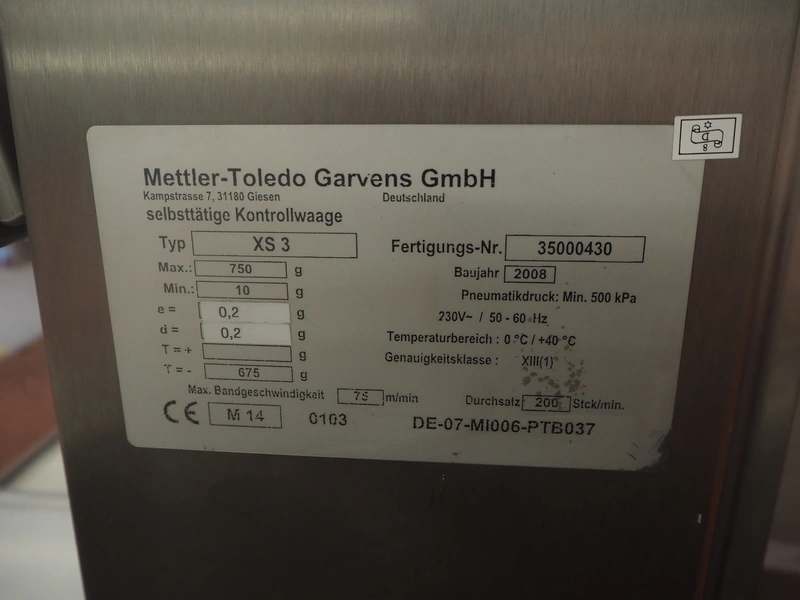 Mettler Toledo Garvens checkweigher with metal detector and 2 rejectors, type: XS 3, number: 35000430, year of construction: 2008, 230 V, 50-60 Hz, maximum weight: 750 gram, minimum weight: 10 gram, e=d=: 0.2 gram, T=: -675 gram, plastic belt, belt width: 200 mm, clearance: 250 mm x 65 mm, total dimensions: 2200 mm x 1200 mm x 1700 mm.