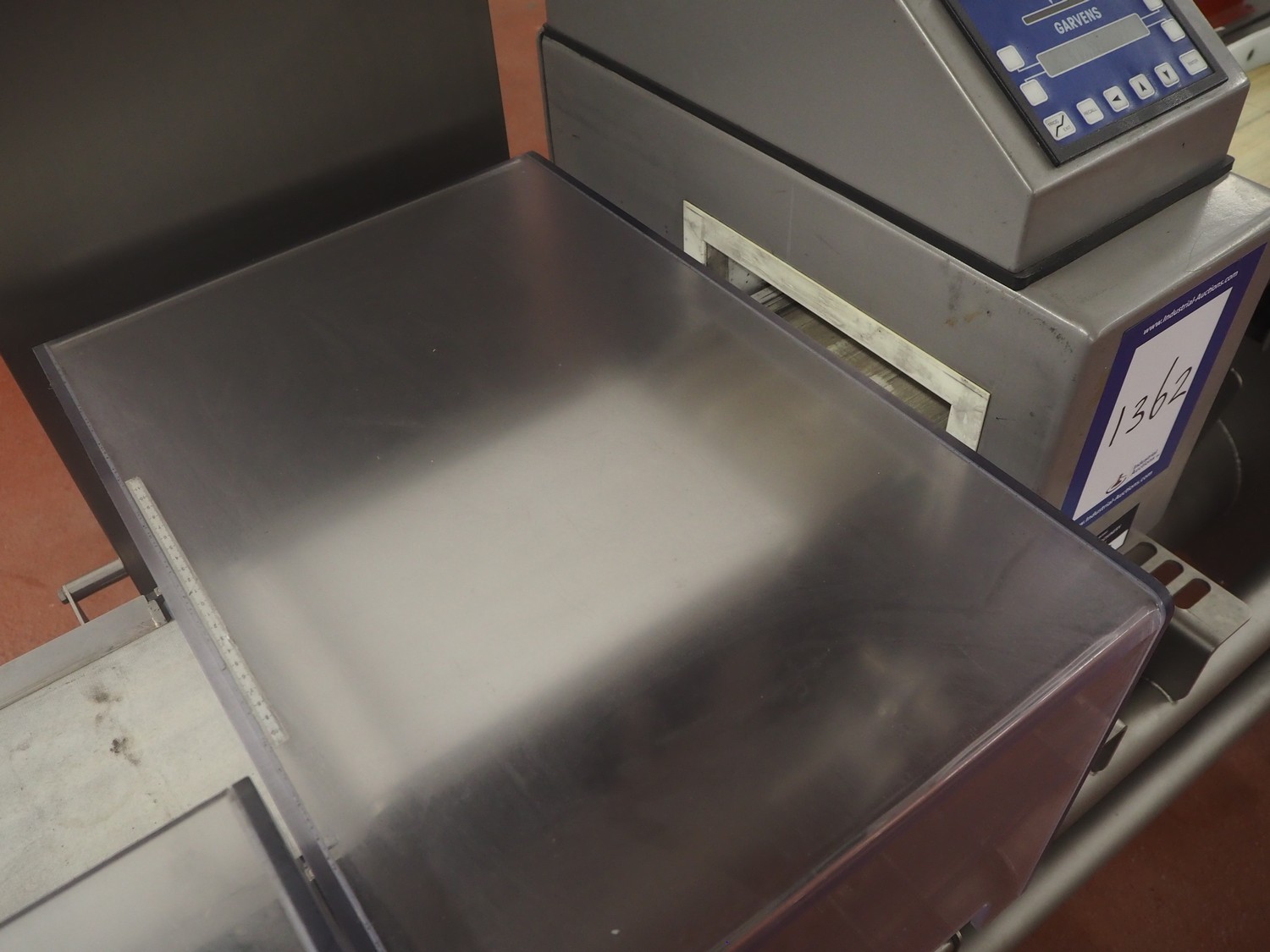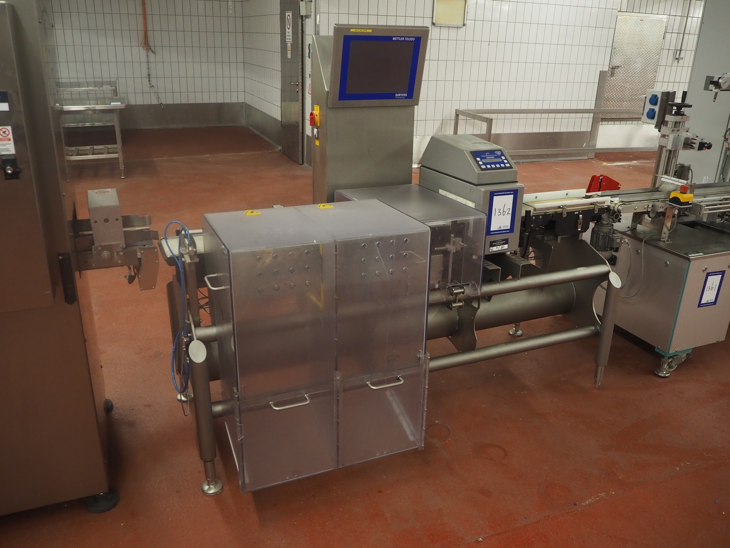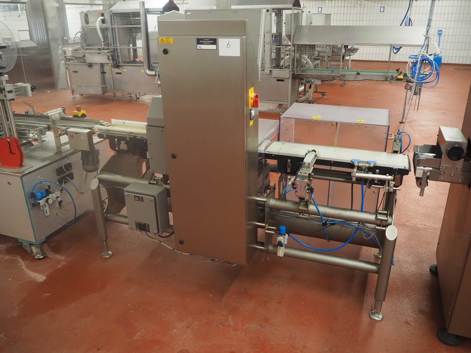 Mettler Toledo Garvens checkweigher with metal detector and 2 rejectors, type: XS 3, number: 35000430, year of construction: 2008, 230 V, 50-60 Hz, maximum weight: 750 gram, minimum weight: 10 gram, e=d=: 0.2 gram, T=: -675 gram, plastic belt, belt width: 200 mm, clearance: 250 mm x 65 mm, total dimensions: 2200 mm x 1200 mm x 1700 mm.