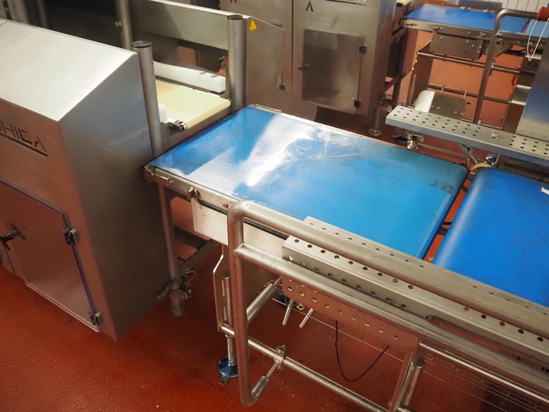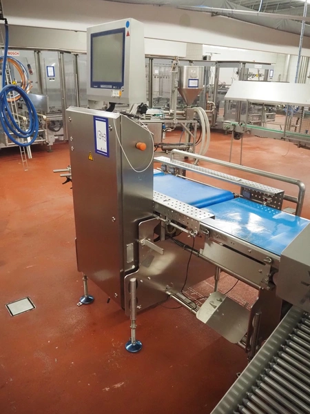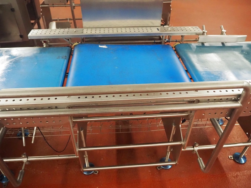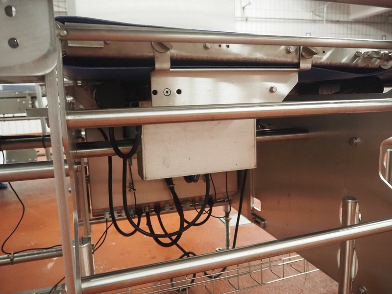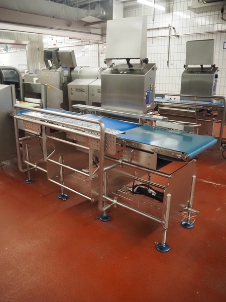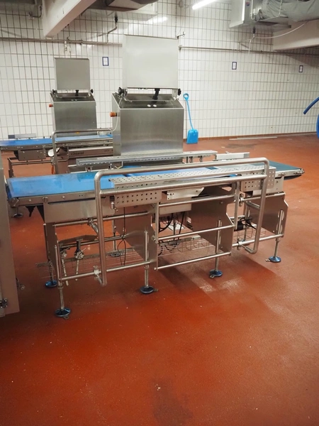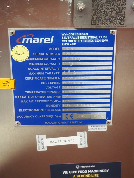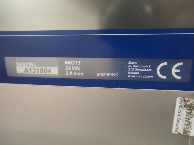 Marel checkweigher, model: 9500, serial number: 95200W, 230 V, 50 Hz, maximum capacity: 27.5 kg, minimum capacity: 2 kg, plastic belt, belt width: 490 mm, total dimensions: 2200 mm x 1100 mm x 1820 mm.