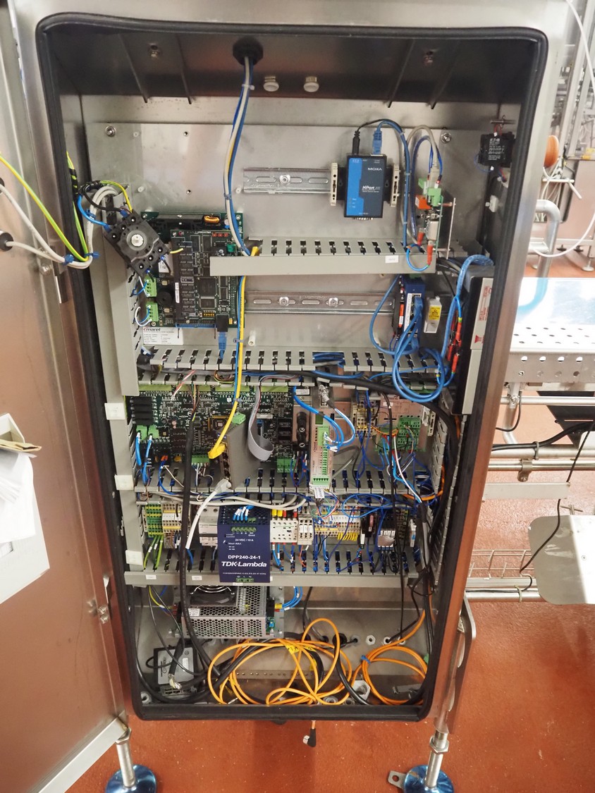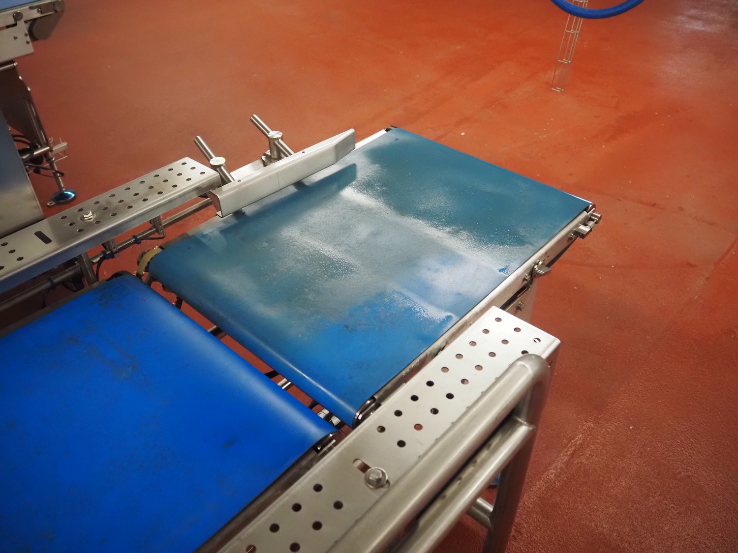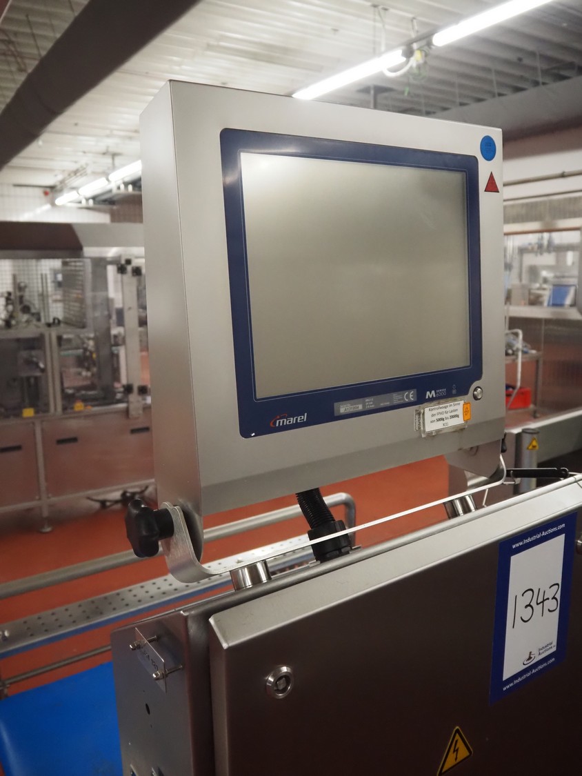 Marel checkweigher, model: 9500, serial number: 95200W, 230 V, 50 Hz, maximum capacity: 27.5 kg, minimum capacity: 2 kg, plastic belt, belt width: 490 mm, total dimensions: 2200 mm x 1100 mm x 1820 mm.