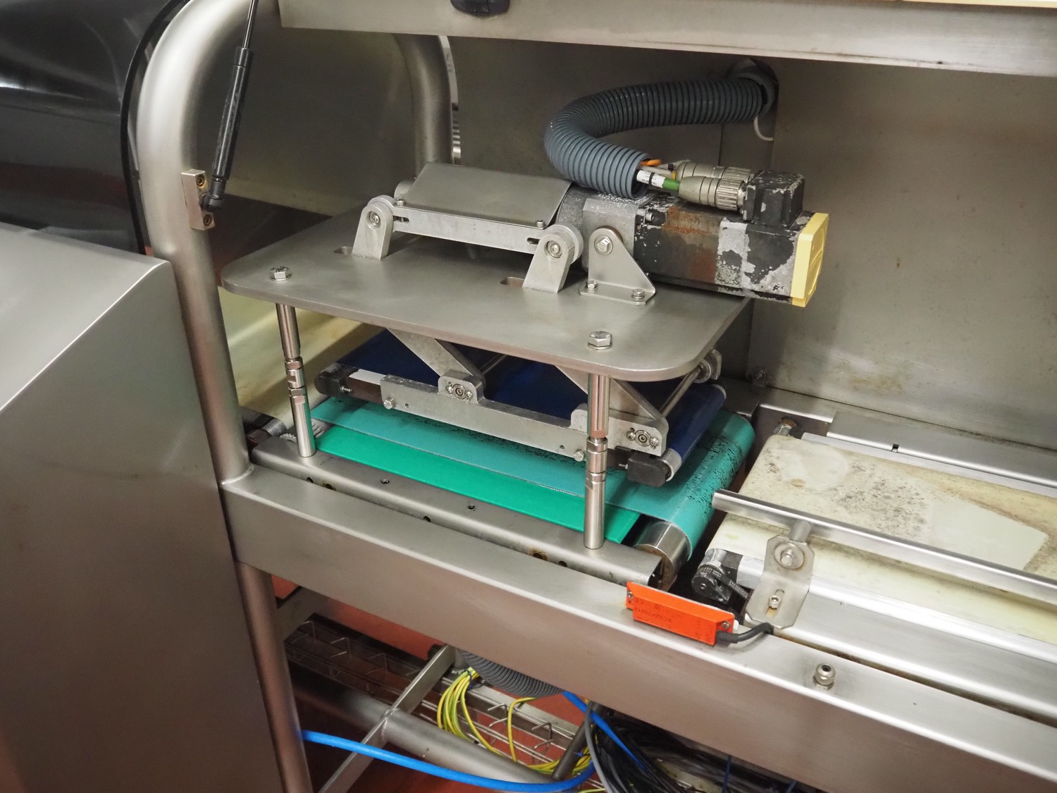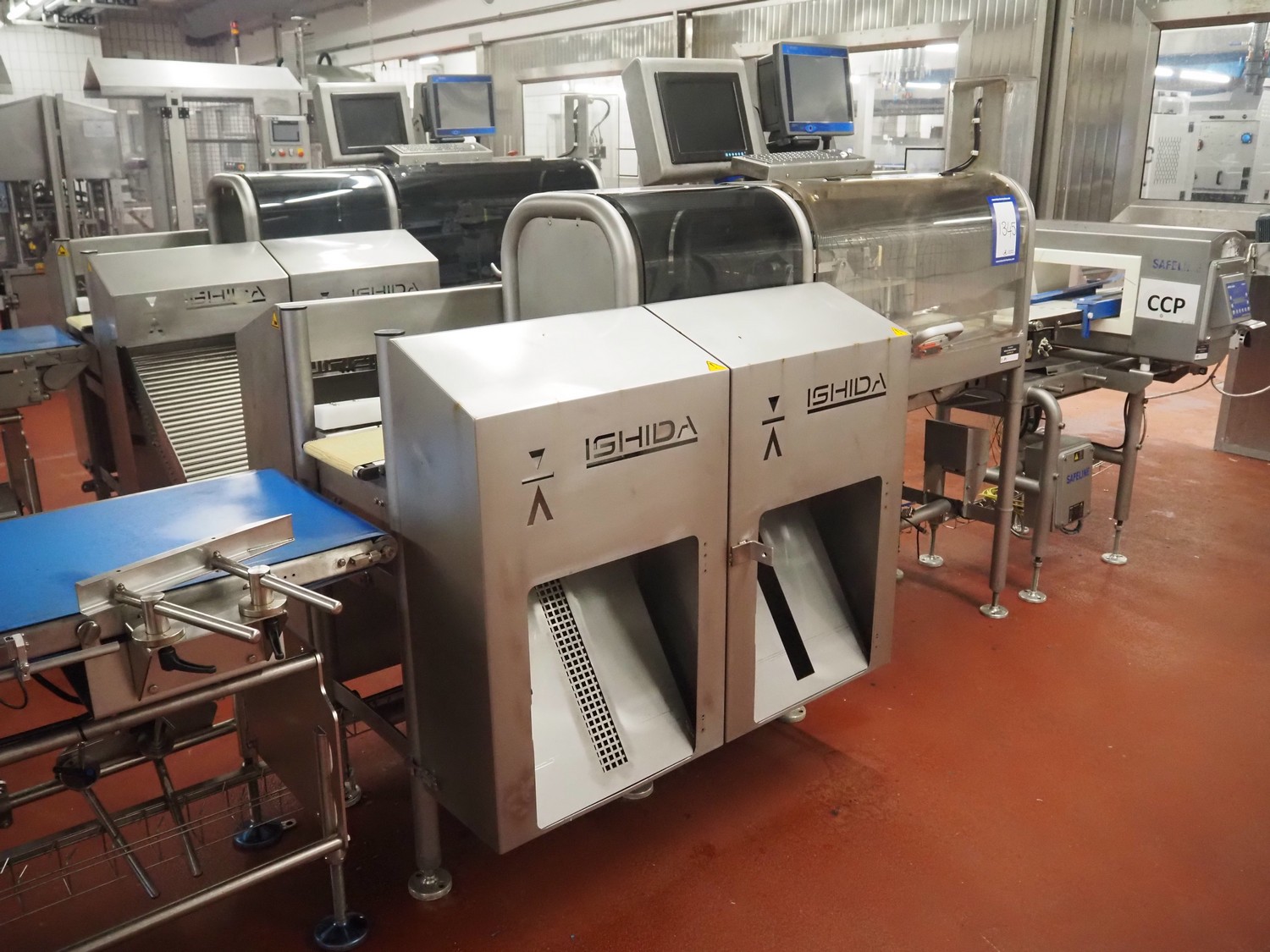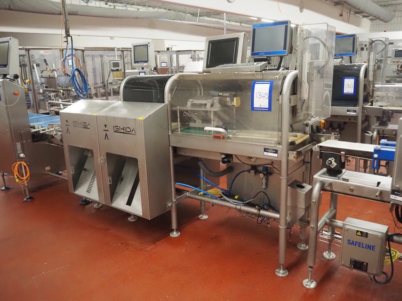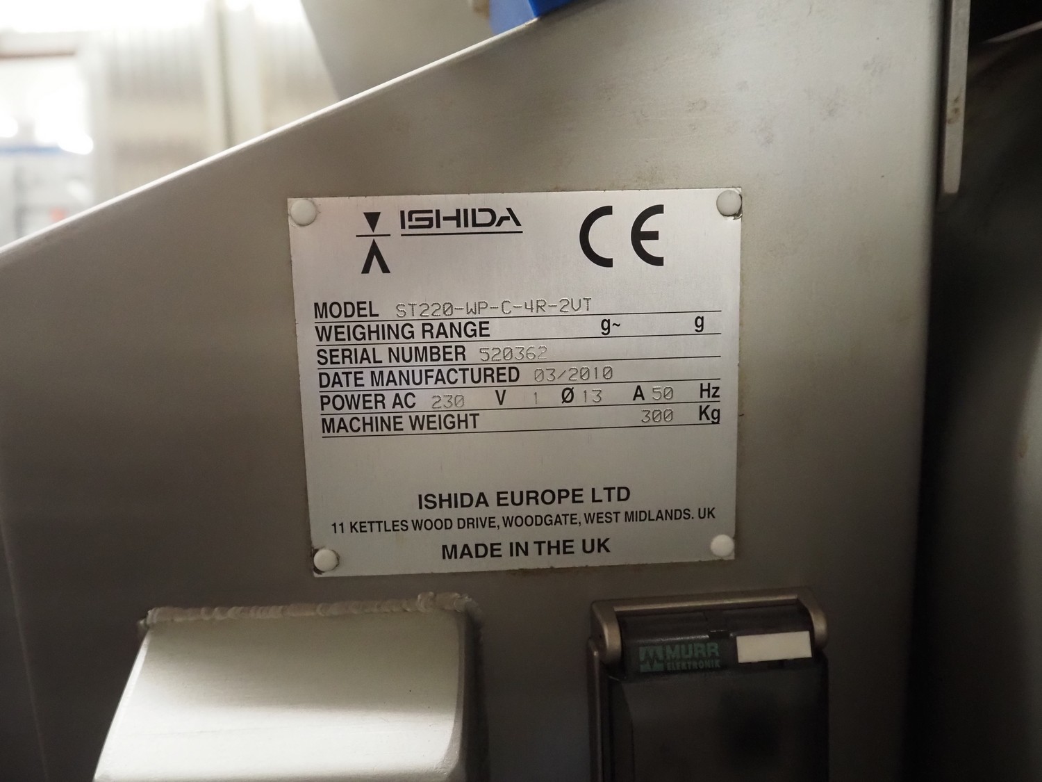 Ishida Europe LTD checkweigher with 4 rejectors, model: ST220-WP-C-4R-2VT, serial number: 520362, year of construction: 03/2010, 230 V, 1 Ph, 50 Hz, 13 A, machine weight: 300 kg, plastic belt, belt width: 220 mm, total dimensions: 2400 mm x 1600 mm x 1750 mm. Incomplete missing camera. Technical condition unknown.