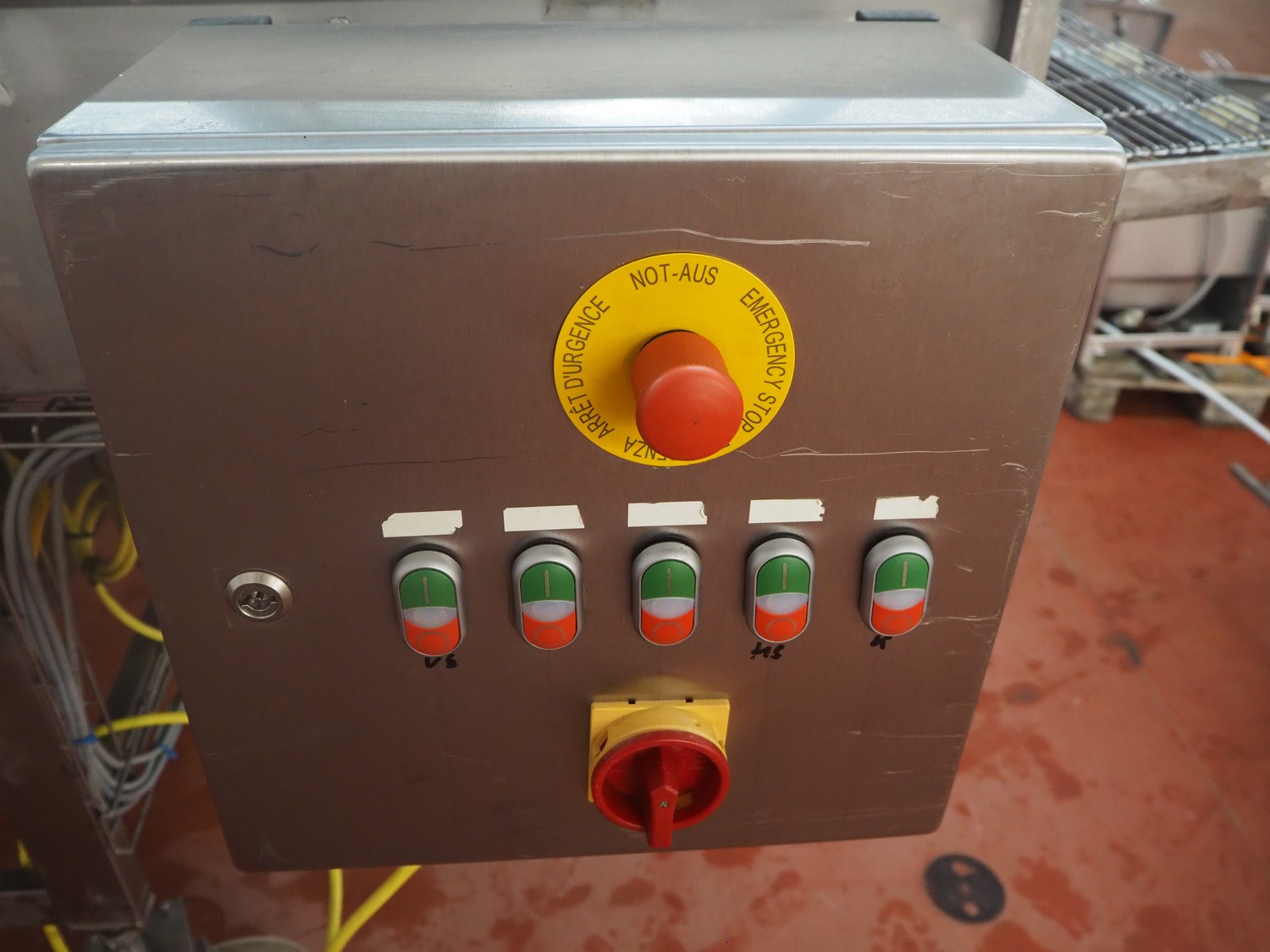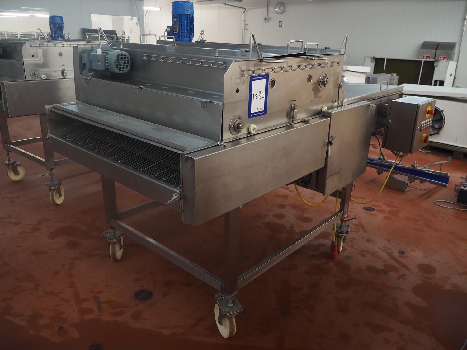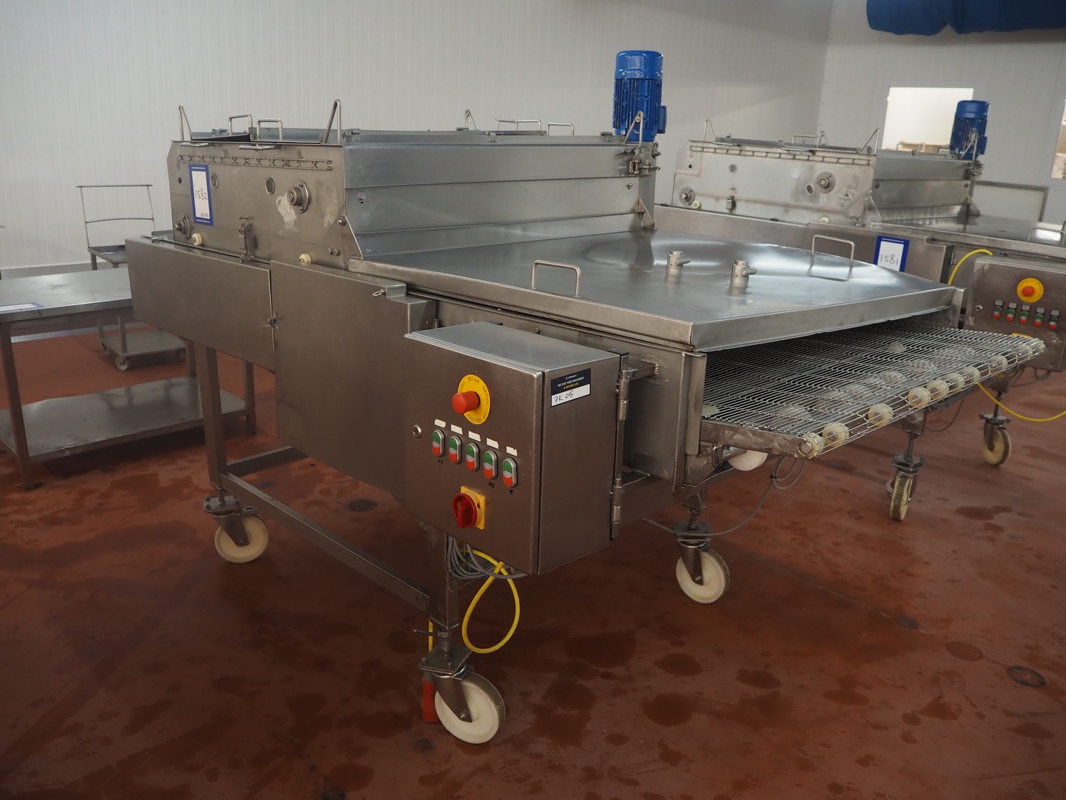 Mobile coating machine, s/s mesh belt, belt width: 1200 mm, total dimensions: 2800 mm x 1600 mm x 1850 mm.