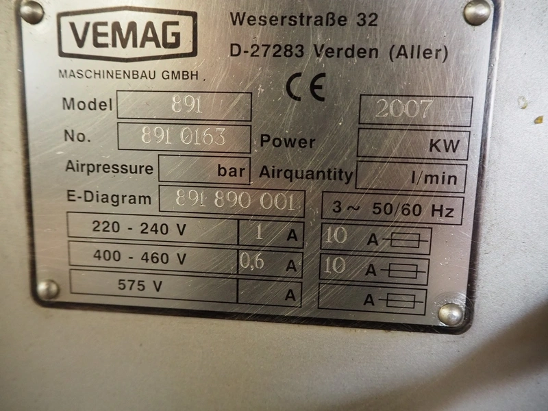 Vemag mobile co-extrusion system, type: 891, number: 891 0163, year of construction: 2007, 220-240/400-460 V, 3 Ph, 50/60 Hz, 1-10/0.6-10 A, dimensions: 750 mm x 400 mm x 1450 mm. Incomplete.