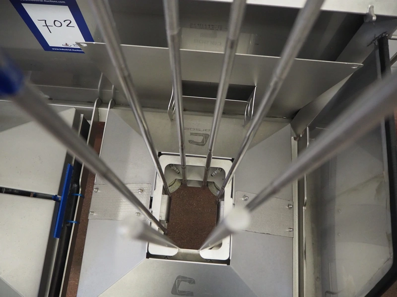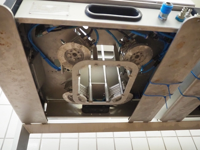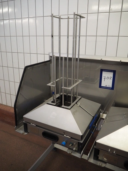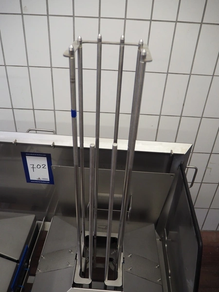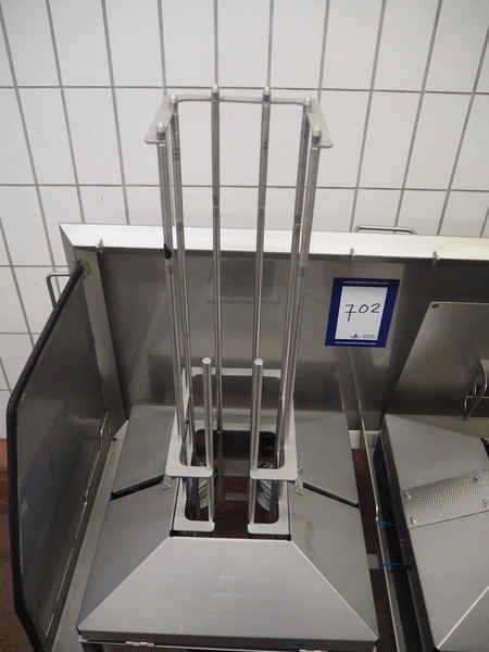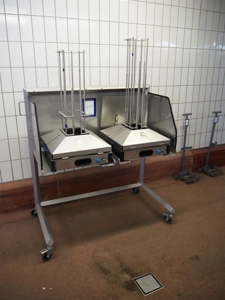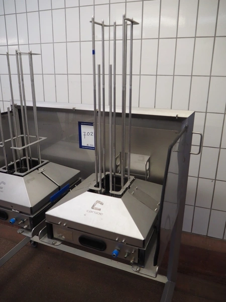 Mobile s/s frame with 2 Carsø denester heads, dimensions: 1300 mm x 700 mm x 1850 mm.