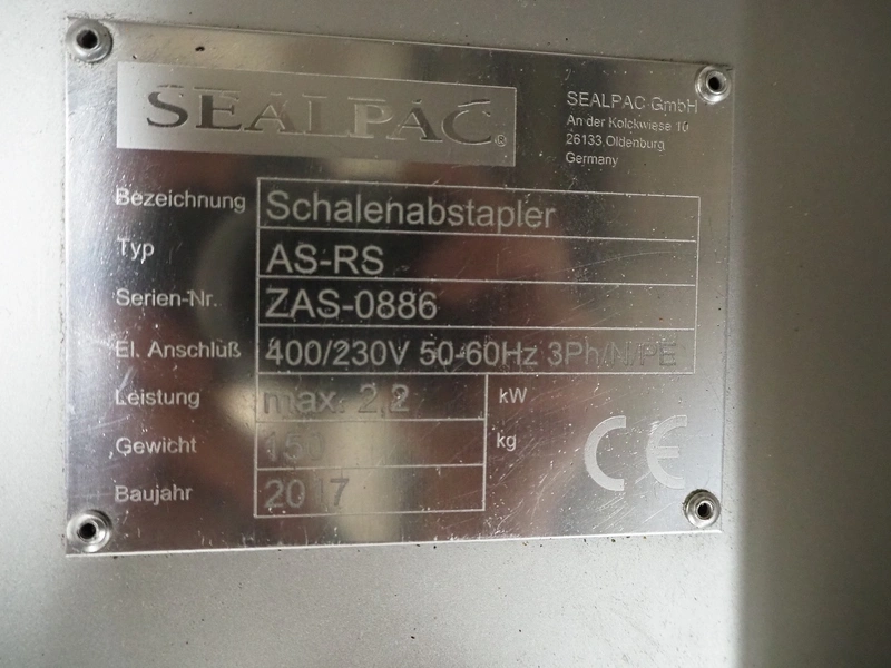 Sealpac denester, type: AS-RS, serial number: ZAS-0886, year of construction: 2017, 400/230 V, 3 Ph, 50/60 Hz, 2.2 kW, dimensions: 1400 mm x 1200 mm x 1850 mm. With 3 pallets with parts.