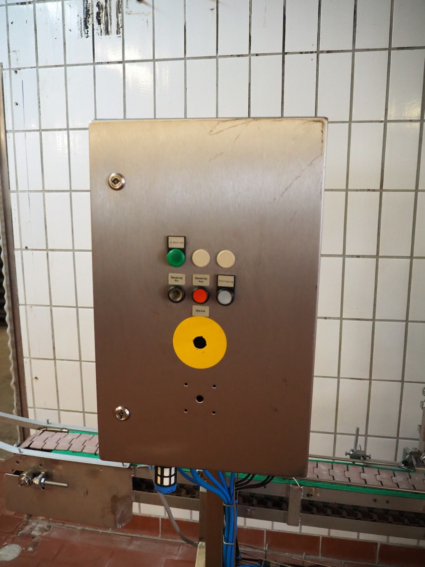 Depositor, plastic belt, belt width: 80 mm, total dimensions: 3020 mm x 560 mm x 2050 mm. Switch cabinet missing buttons.