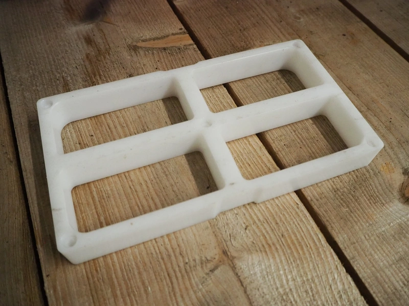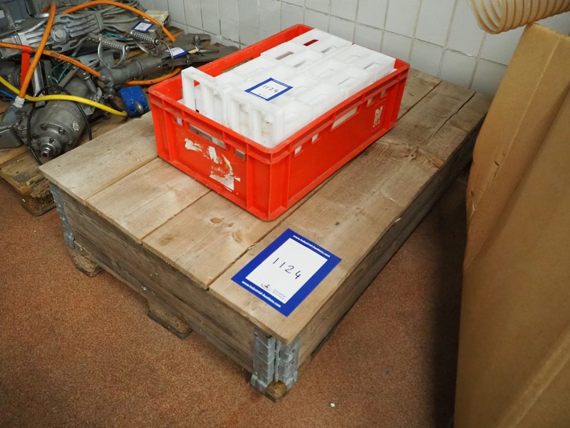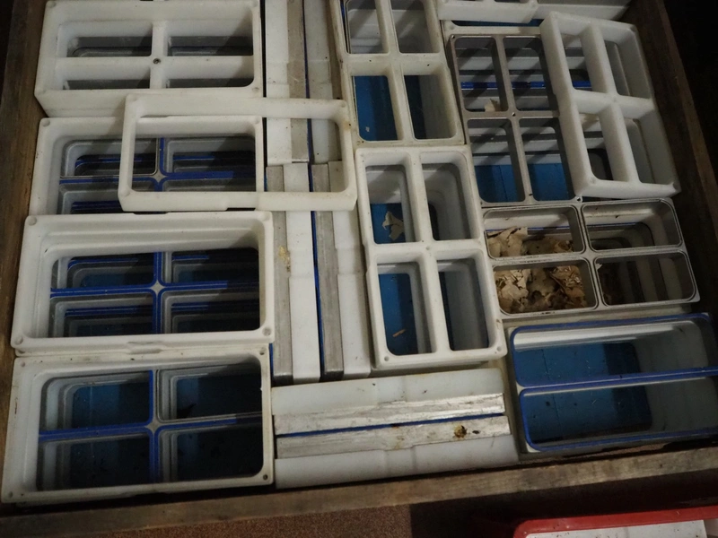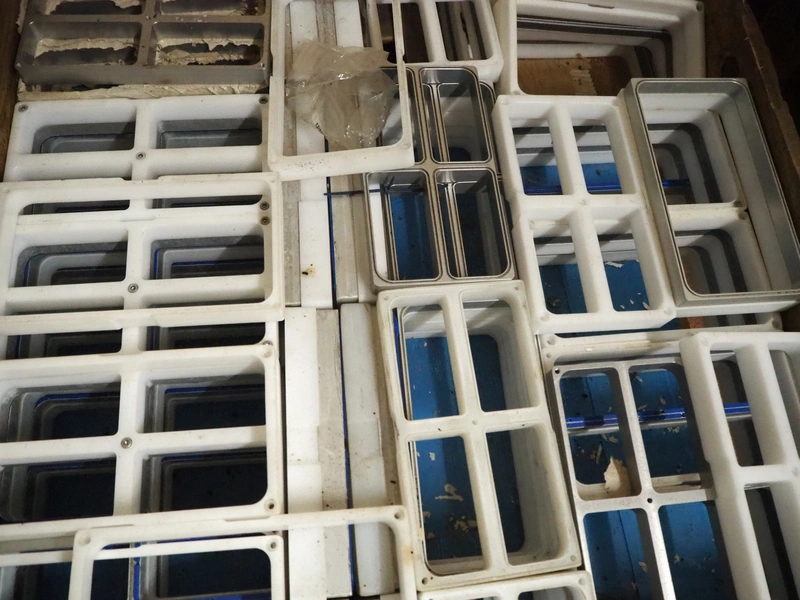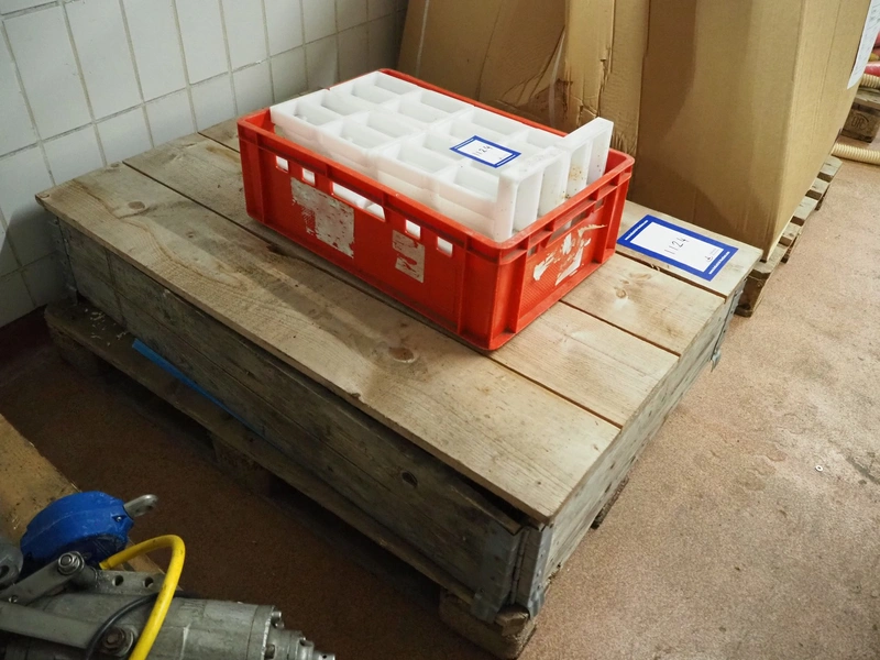 Crate with 35 plastic forms, 4 dyes per form, dimensions dyes: (4x) 55 mm x 110 mm, dimensions form: (35x) 135 mm x 250 mm, dimensions crate: 400 mm x 600 mm and wooden box with large amount of dyes, dimensions: 240 mm x 125 mm and 115 mm x 60 mm and 240 mm x 60 mm.