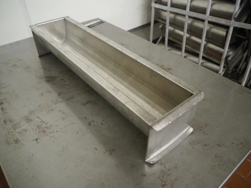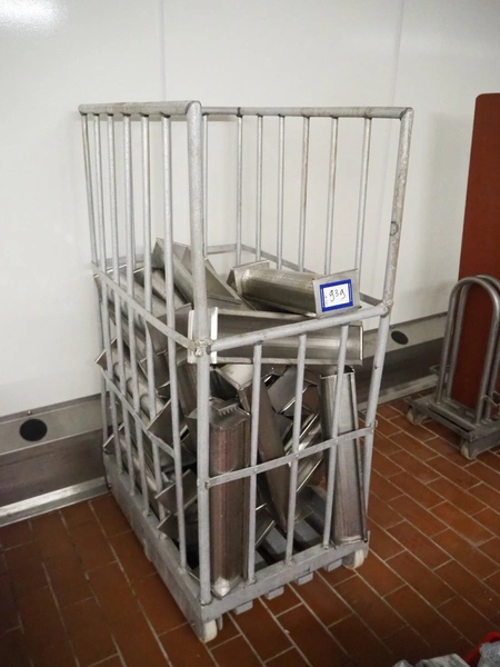 Aluminium trolley with large amount of s/s ham moulds, dimensions ham moulds: 540 mm x 120 mm x 120 mm.