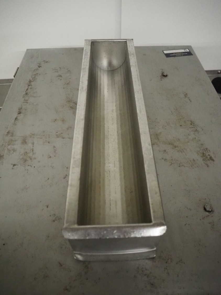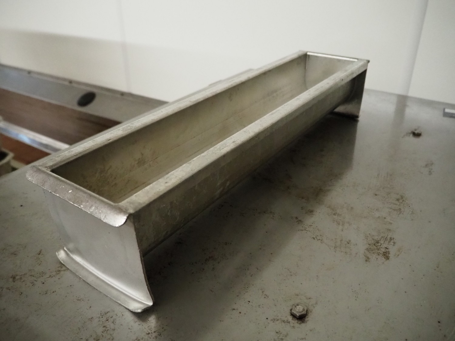 Aluminium trolley with large amount of s/s ham moulds, dimensions ham moulds: 540 mm x 120 mm x 120 mm.