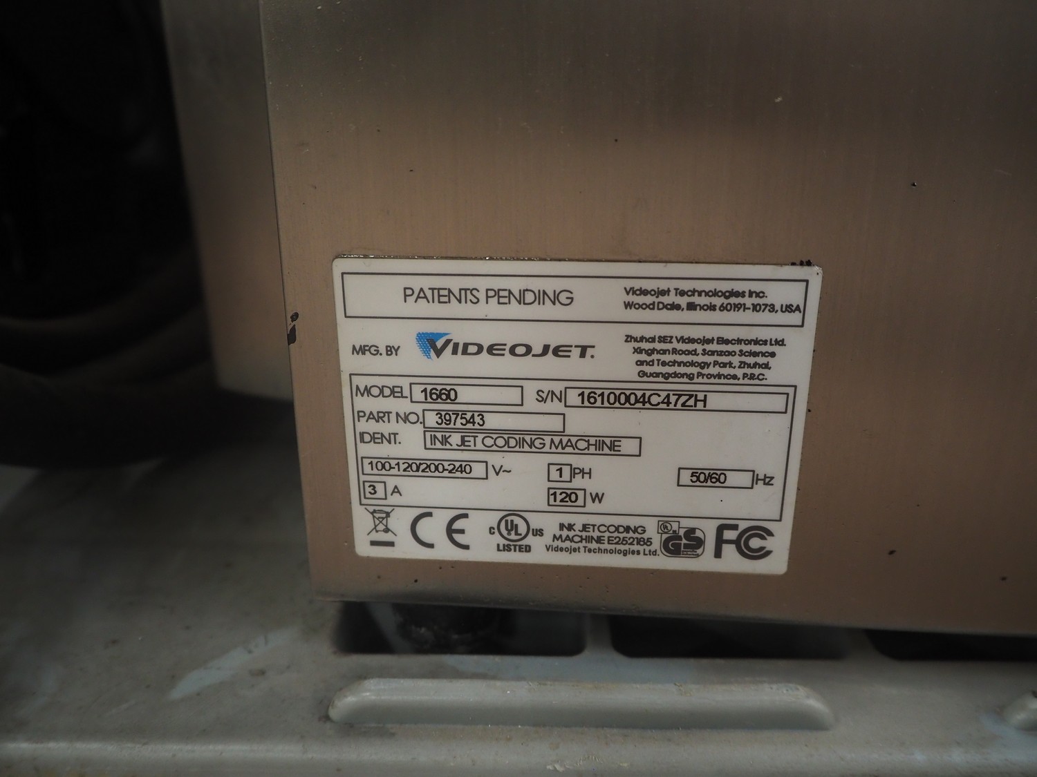 4 Videojet inkjet printers, model: (2x) 1650, (2x) 1660, serial number: 1610002C47ZH, 1610004C47ZH, 1409769C30ZH, 1234329C30ZH, dimensions: (4x) 350 mm x 300 mm x 570 mm. Technical condition unknown.