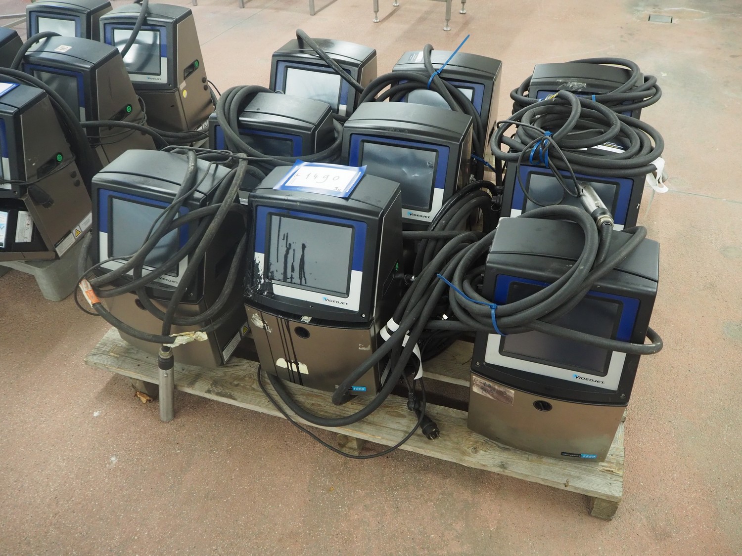 9 Videojet inkjet printers, model: (3x) 1650 and (6x) 1660, serial number: 1417996C30ZH, 18081004C47ZH, 17041006C47ZH, 1610006C47ZH, 1610005C47ZH, 1409773C30ZH, 1433209C47ZH, 1409772C30ZH, 17076007C47ZH, dimensions: (9x) 350 mm x 300 mm x 570 mm. Technical condition unknown.