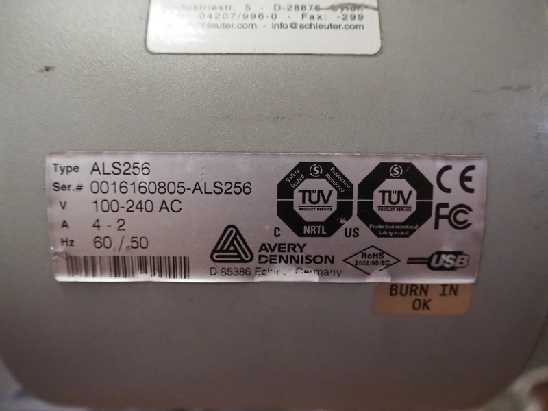Avery Dennison mobile labelling machine, type: ALS256, serial number: 0016160805-ALS256, 100-240 V, 60/50 Hz, 4-2 A, dimensions: 900 mm x 800 mm x 1700 mm.