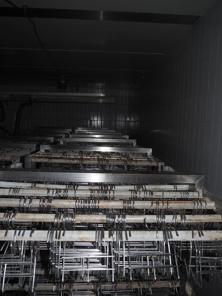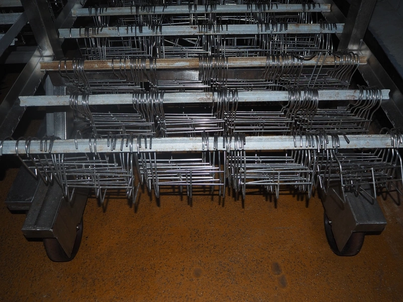 7 s/s H-profile smoke trolleys with large amount of meat hooks, 7 x 4 floors, dimensions each floor: 920 mm x 880 mm, dimensions hooks: 130 mm x 90 mm x 120 mm and 150 mm x 90 mm x 150 mm, total dimensions: (7x) 920 mm x 920 mm x 2100 mm.