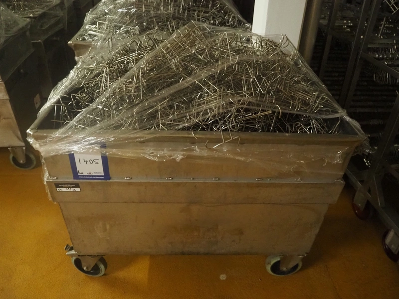 6 s/s containers with large amount of meat hooks, dimensions each hook: 130 mm x 120 mm x 50 mm, total dimensions: (6x) 1250 mm x 800 mm x 1400 mm.