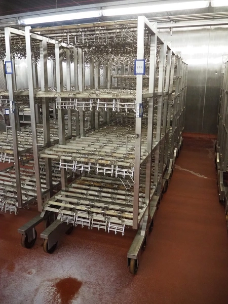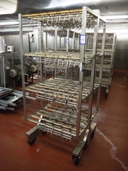 5 s/s H-profile smoke trolleys with large amount of meat hooks, 6 floors, dimensions each floor: 920 mm x 900 mm, dimensions hooks: 130 mm x 90 mm x 120 mm, total dimensions: (5x) 920 mm x 900 mm x 2090 mm.