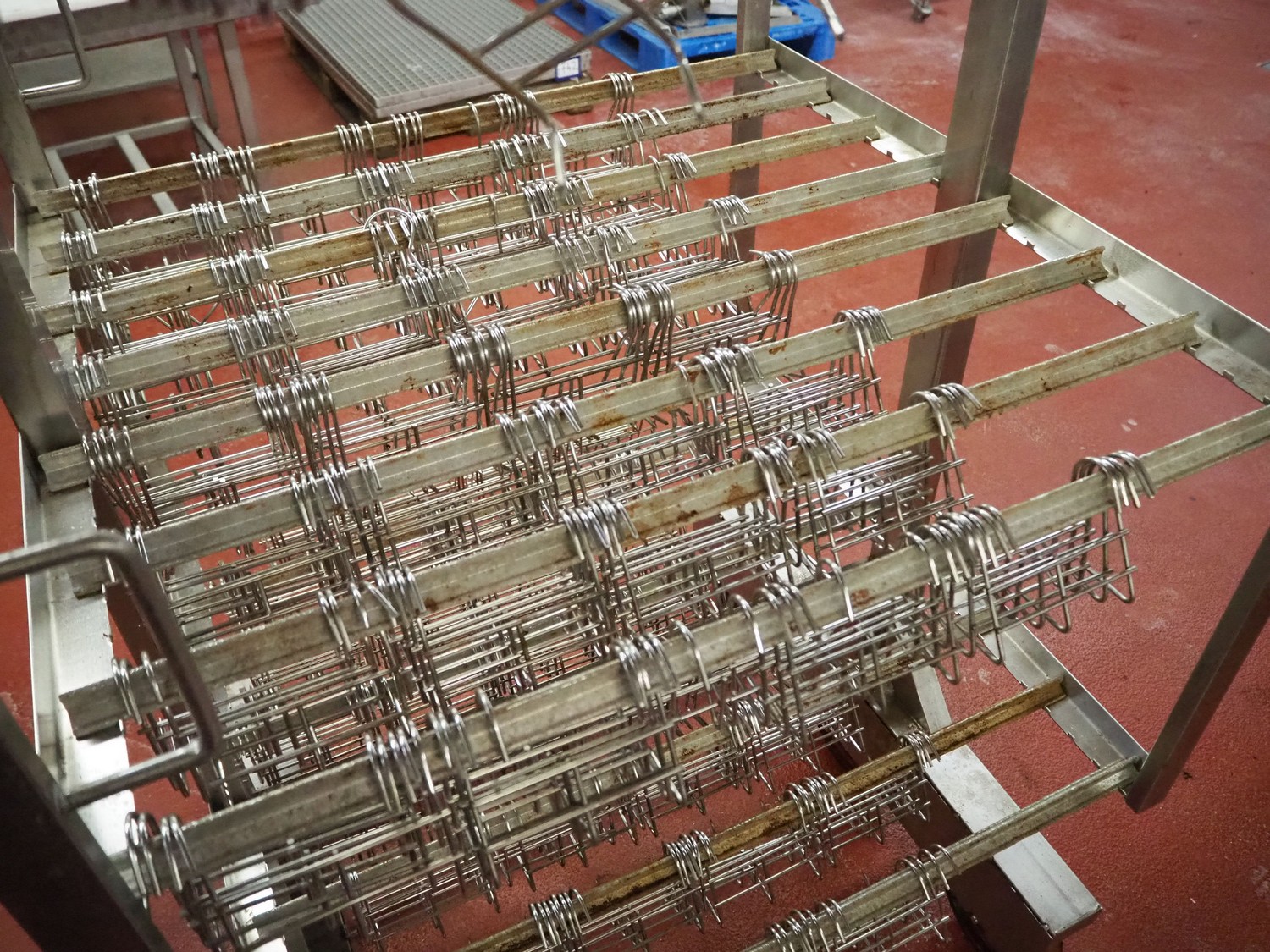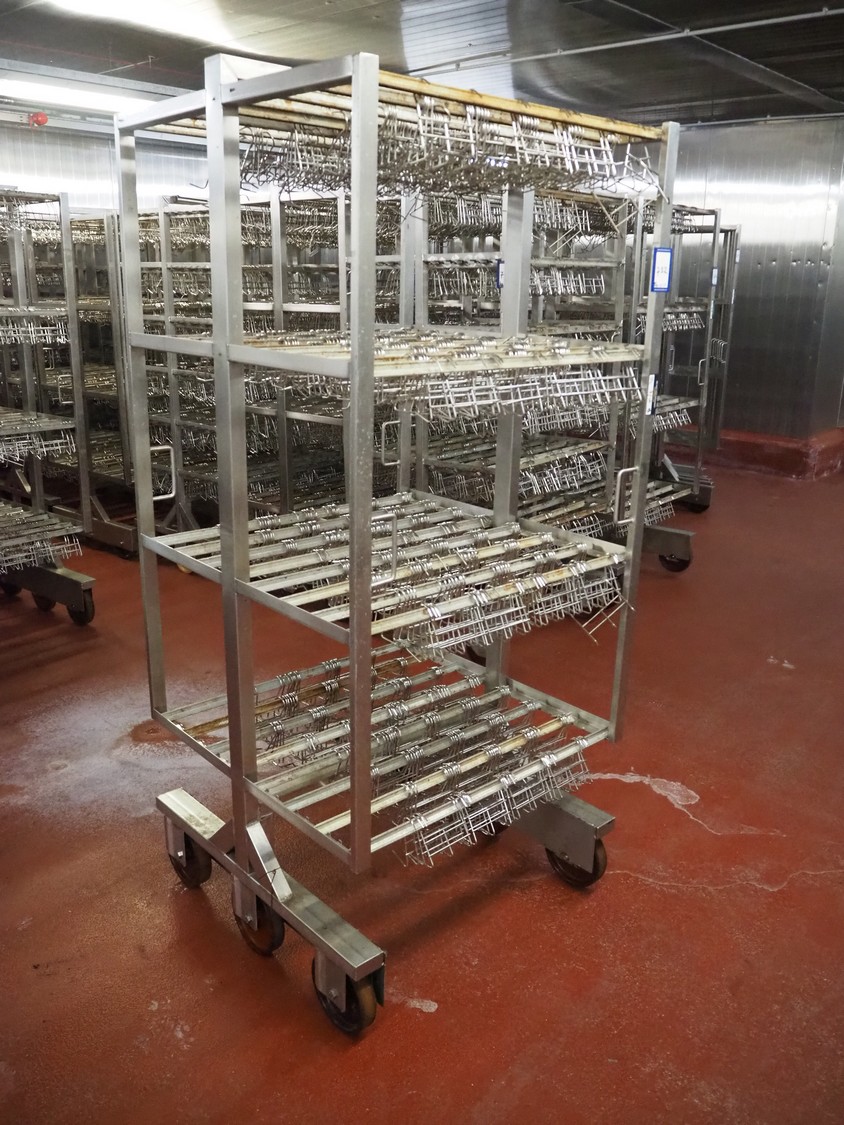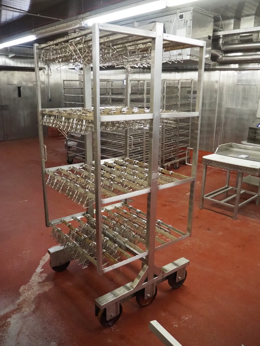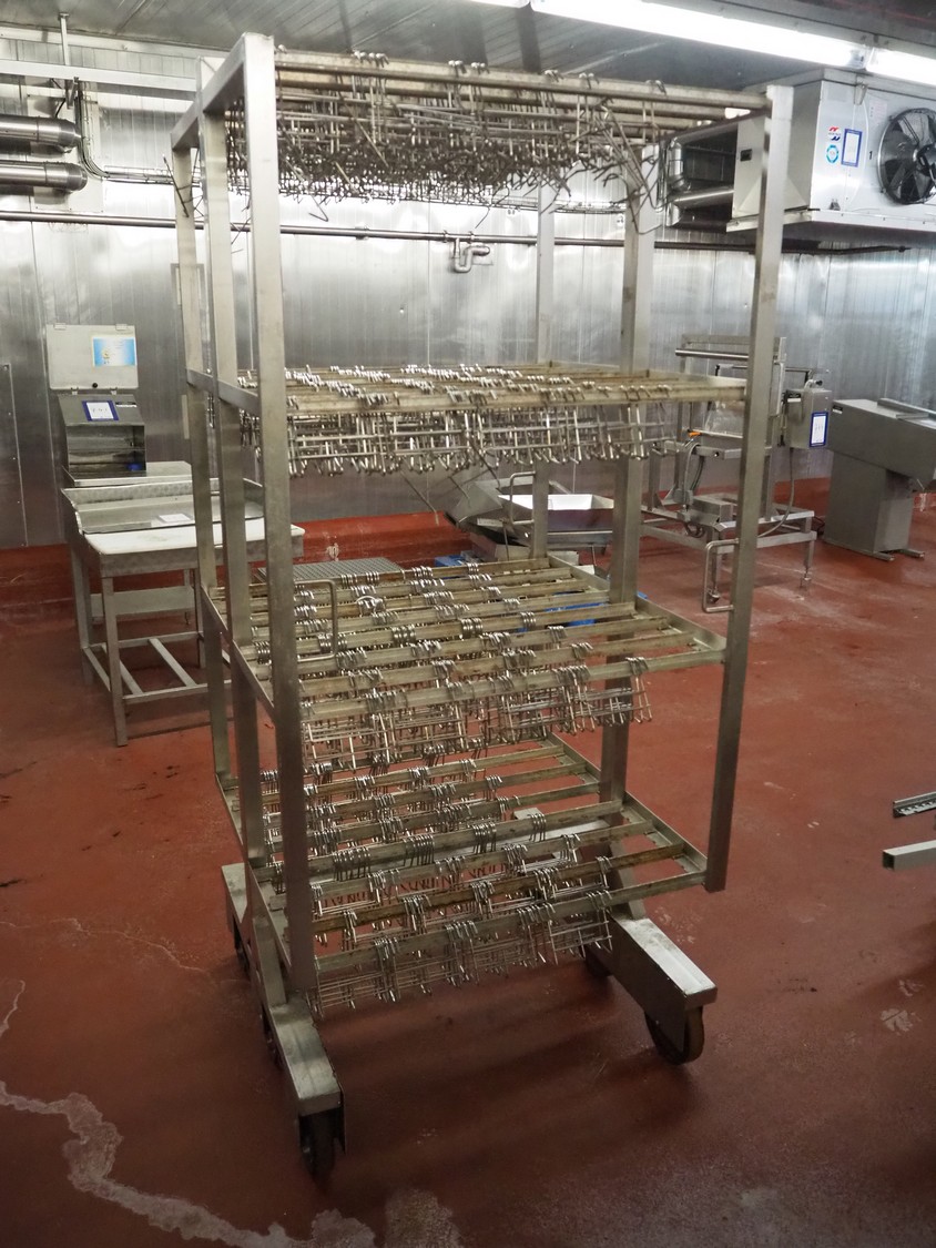 5 s/s H-profile smoke trolleys with large amount of meat hooks, 6 floors, dimensions each floor: 920 mm x 900 mm, dimensions hooks: 130 mm x 90 mm x 120 mm, total dimensions: (5x) 920 mm x 900 mm x 2090 mm.
