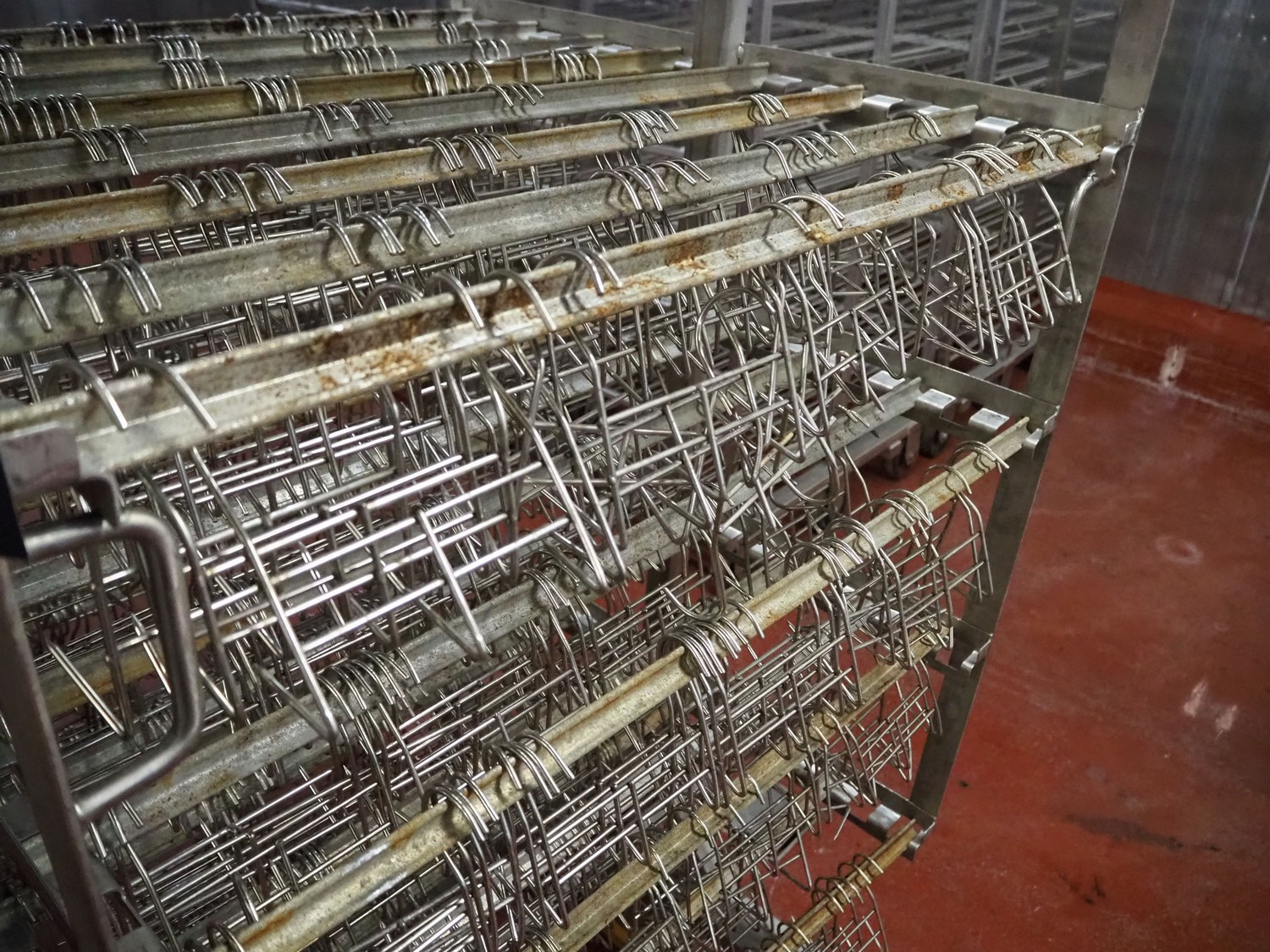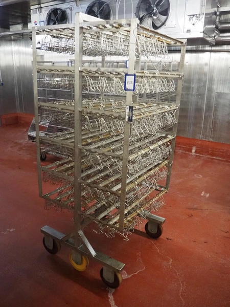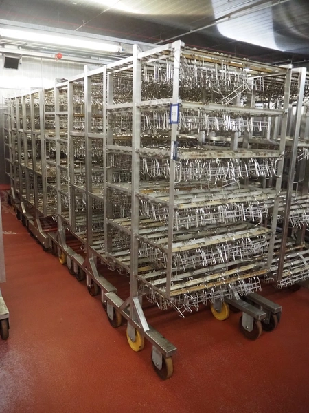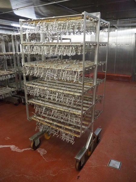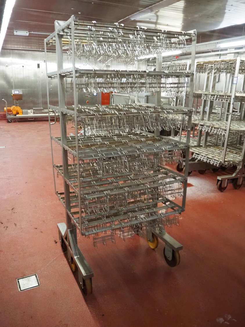 6 s/s H-profile smoke trolleys with large amount of meat hooks, 6 floors, dimensions each floor: 920 mm x 900 mm, dimensions hooks: 130 mm x 90 mm x 120 mm, total dimensions: (6x) 920 mm x 900 mm x 2090 mm.
