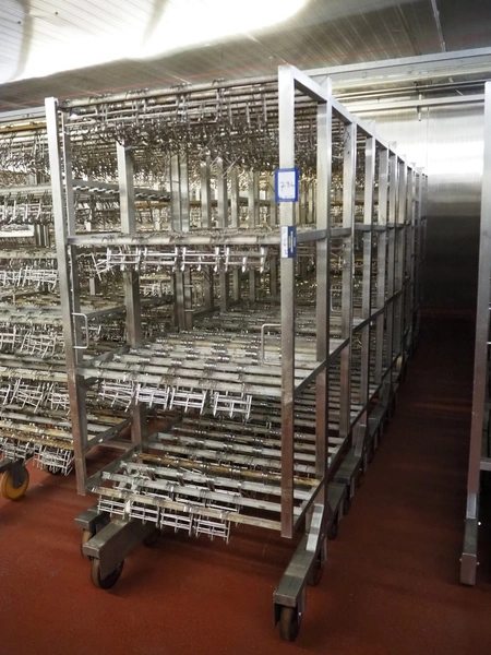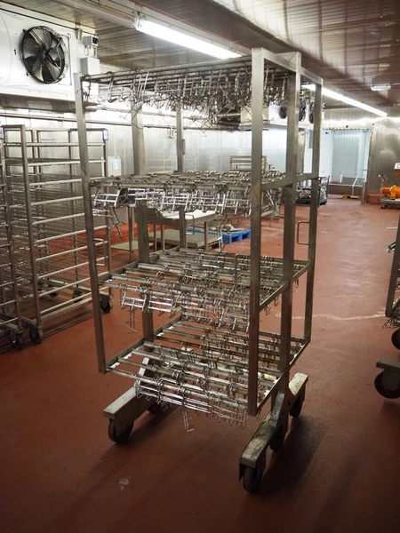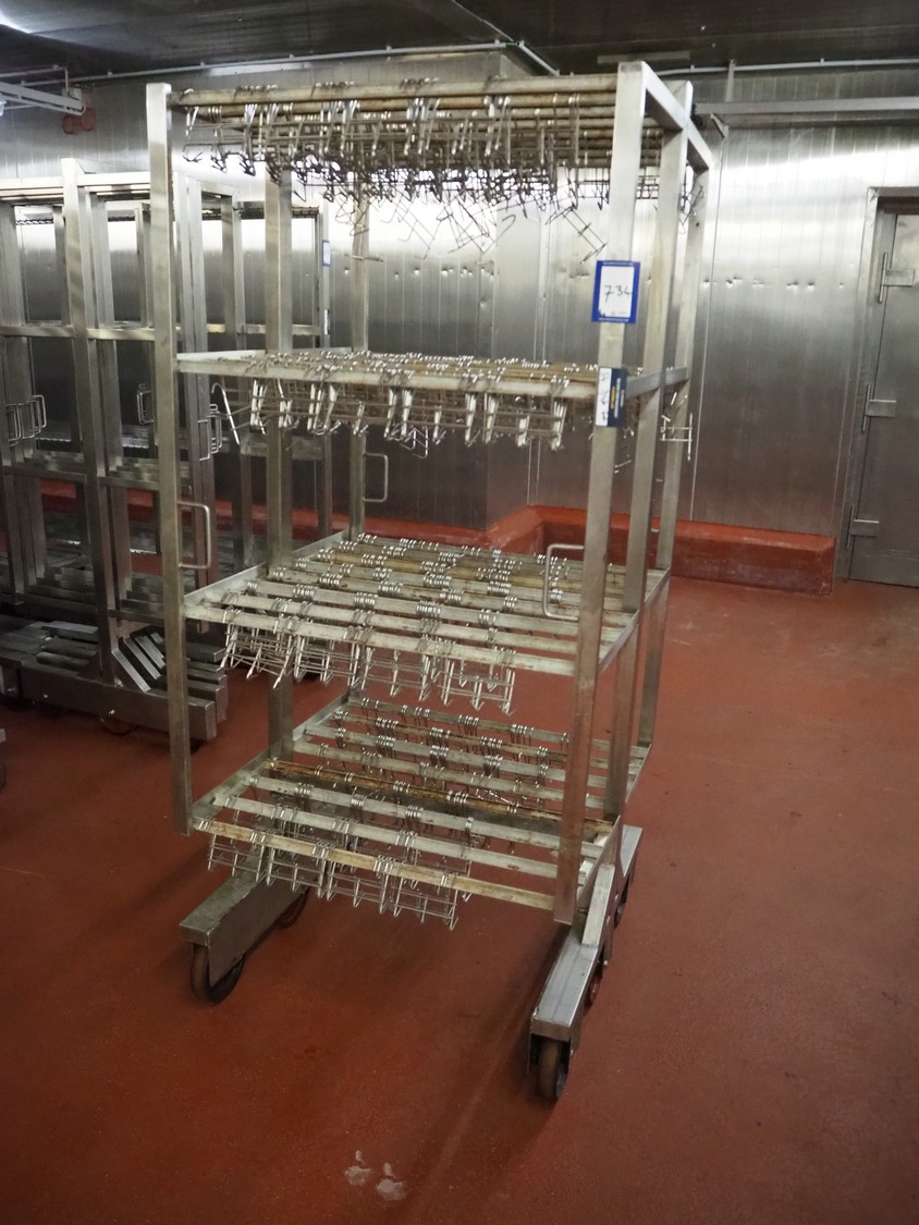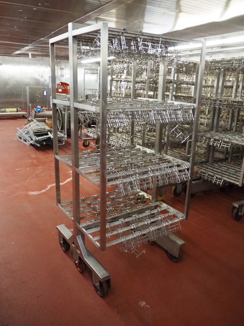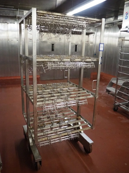6 s/s H-profile smoke trolleys with large amount of meat hooks, 6 floors, dimensions each floor: 920 mm x 900 mm, dimensions hooks: 130 mm x 90 mm x 120 mm, total dimensions: (6x) 920 mm x 900 mm x 2090 mm.