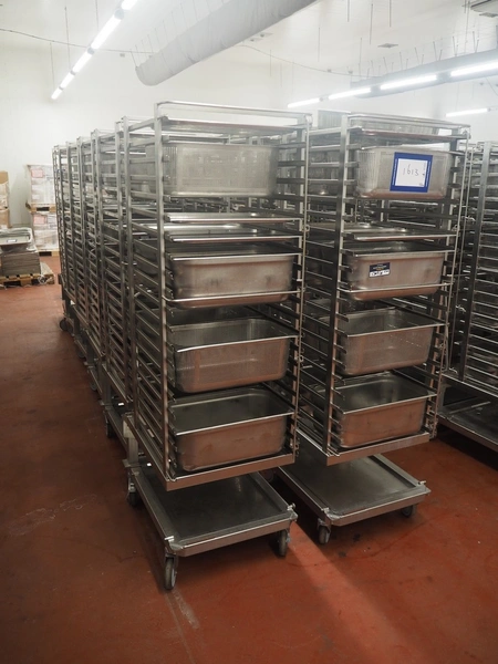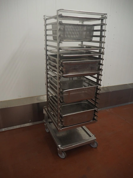 12 s/s trolleys for combisteamer with large amount of s/s gastronorm bins, 21 floors, dimensions floors: (21x) 650 mm x 535 mm, total dimensions: (12x) 850 mm x 580 mm x 1860 mm.