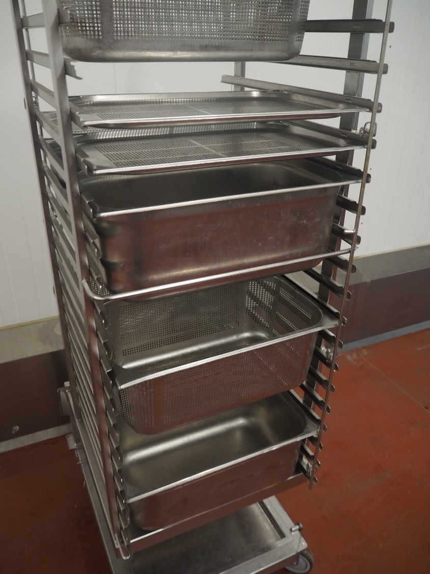 12 s/s trolleys for combisteamer with large amount of s/s gastronorm bins, 21 floors, dimensions floors: (21x) 650 mm x 535 mm, total dimensions: (12x) 850 mm x 580 mm x 1860 mm.