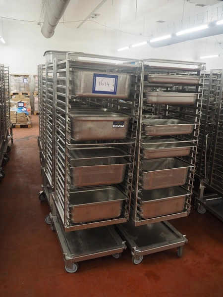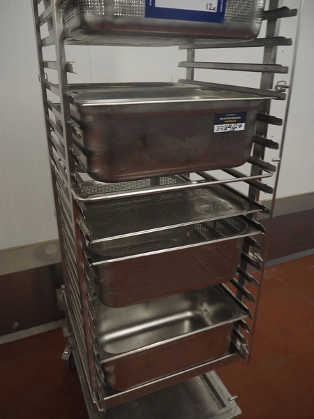 12 s/s trolleys for combisteamer with large amount of s/s gastronorm bins, 21 floors, dimensions floors: (21x) 650 mm x 535 mm, total dimensions: (12x) 850 mm x 580 mm x 1860 mm.