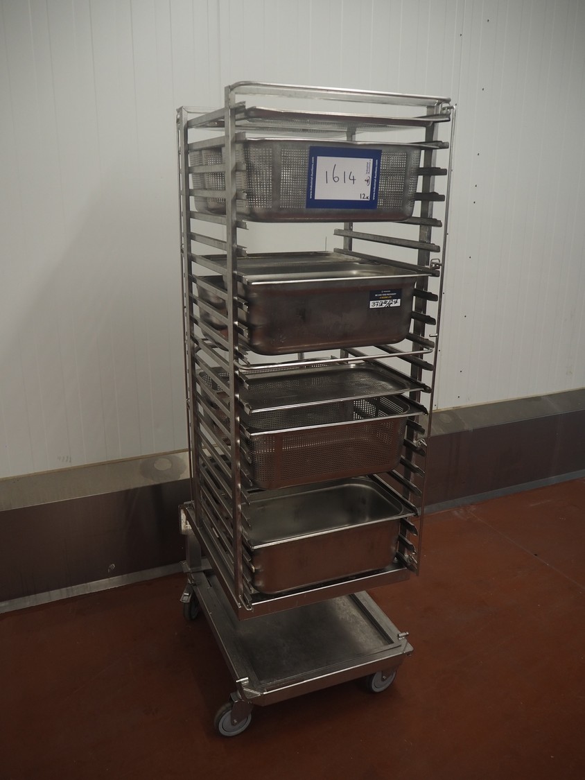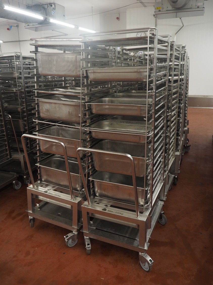 12 s/s trolleys for combisteamer with large amount of s/s gastronorm bins, 21 floors, dimensions floors: (21x) 650 mm x 535 mm, total dimensions: (12x) 850 mm x 580 mm x 1860 mm.