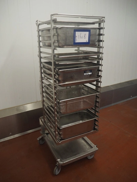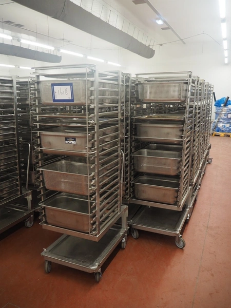 11 s/s trolleys for combisteamer with large amount of s/s gastronorm bins, 21 floors, dimensions floors: (21x) 650 mm x 535 mm, total dimensions: (11x) 850 mm x 580 mm x 1860 mm.
