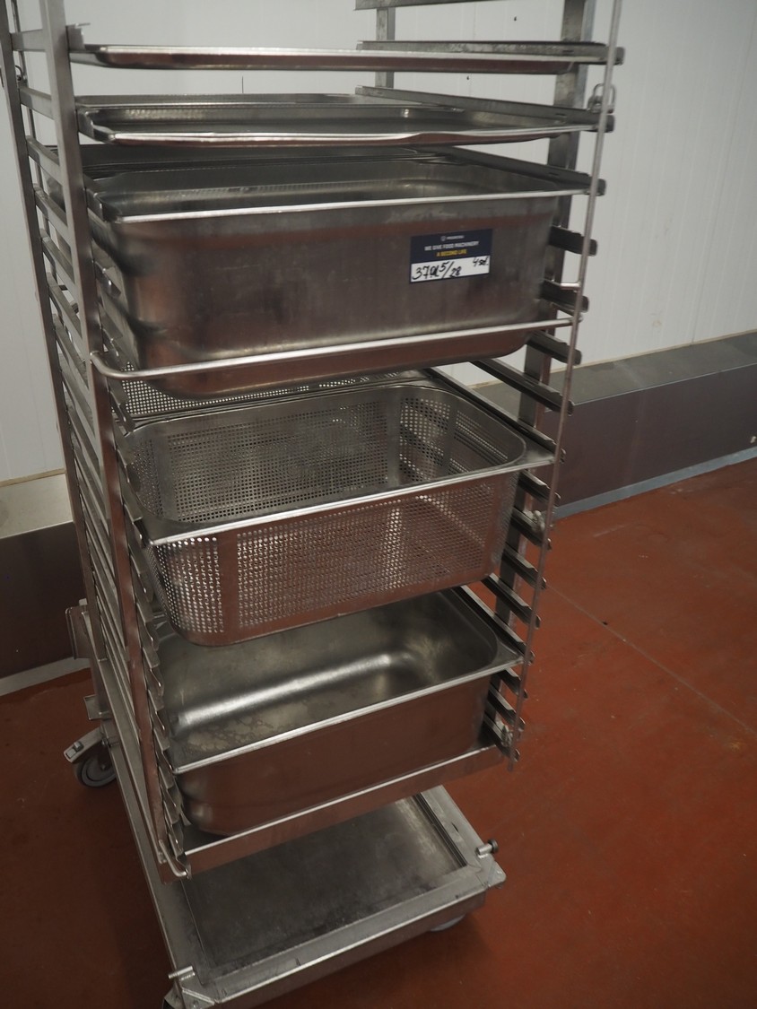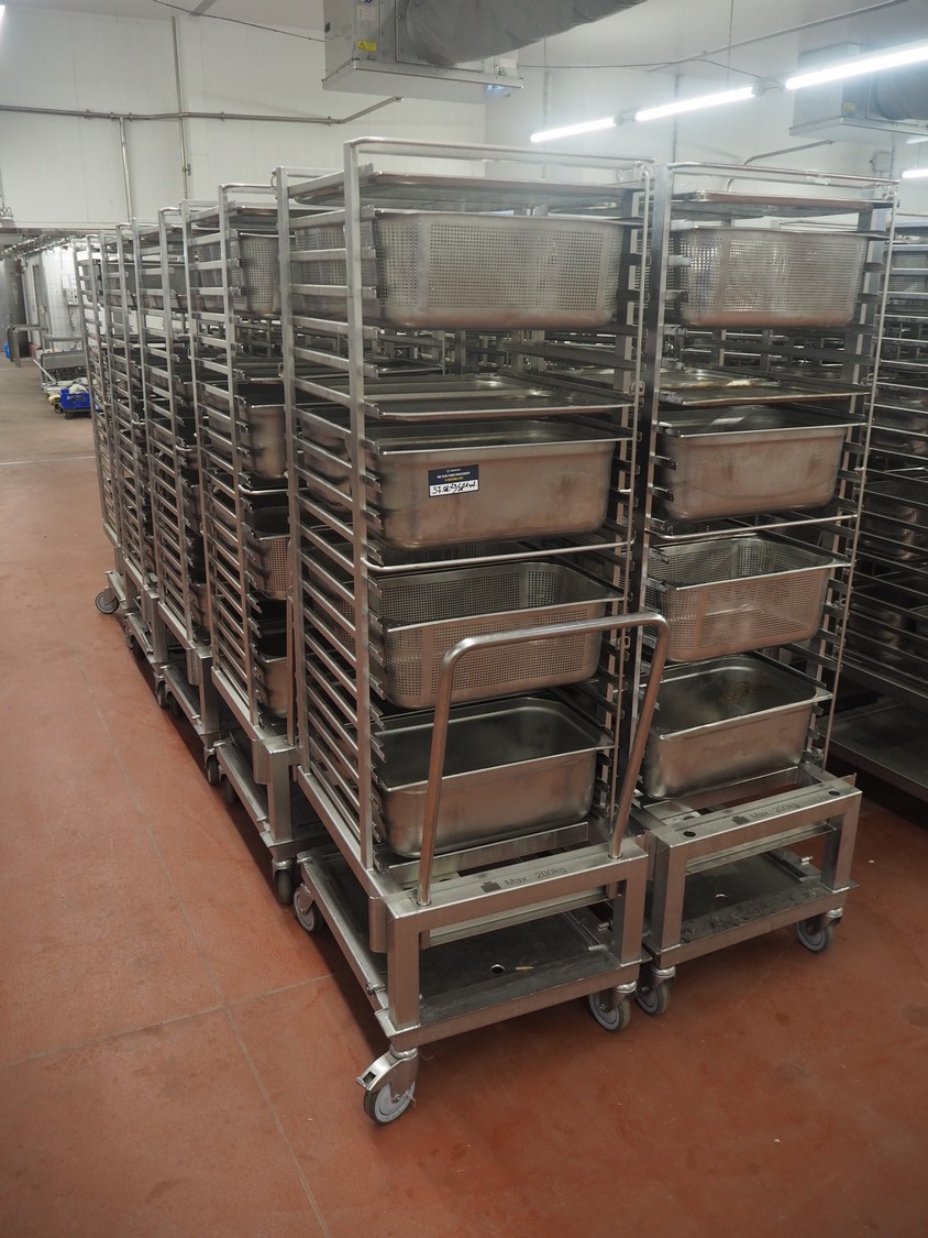 11 s/s trolleys for combisteamer with large amount of s/s gastronorm bins, 21 floors, dimensions floors: (21x) 650 mm x 535 mm, total dimensions: (11x) 850 mm x 580 mm x 1860 mm.