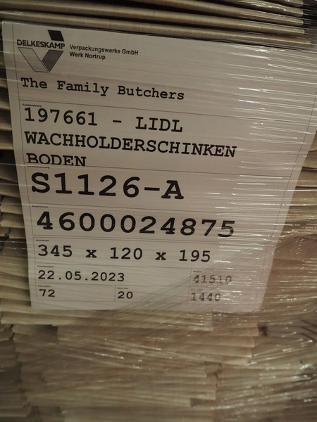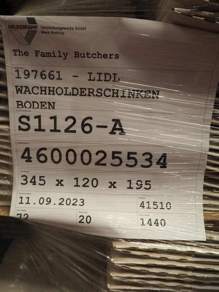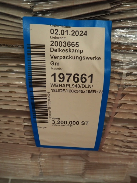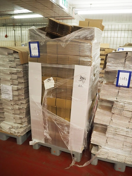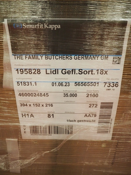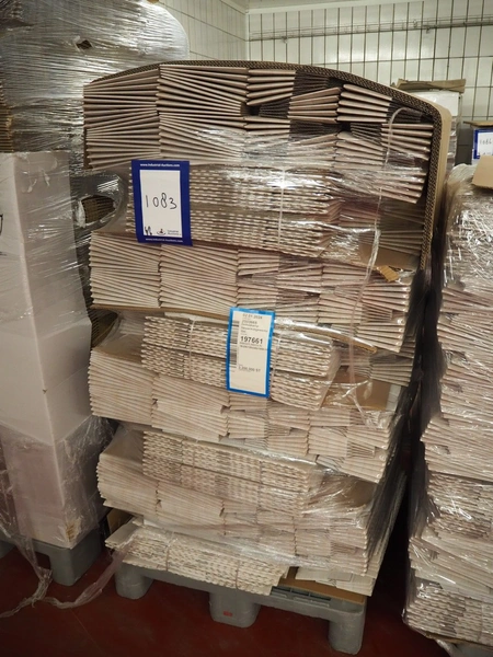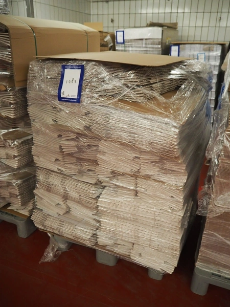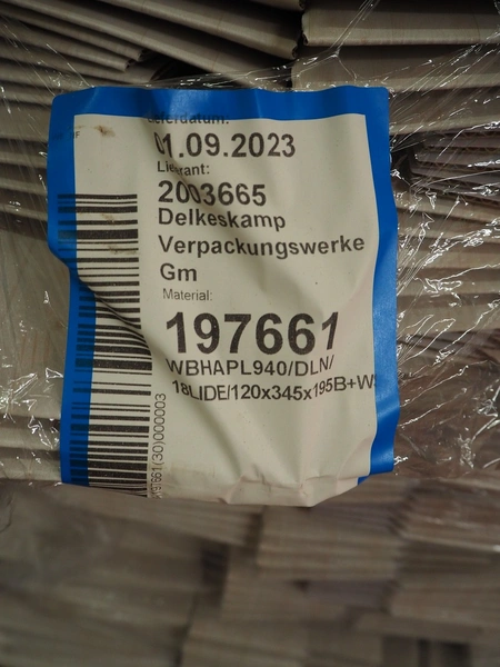 6 pallets with Smurfit Kappa carton boxes, dimensions boxes: (1x) 270 mm x 190 mm x 235 mm, (2x) 394 mm x 152 mm x 216 mm, (3x) 345 mm x 120 mm x 195 mm, total dimensions: (6x) 1200 mm x 800 mm x 1700 mm.